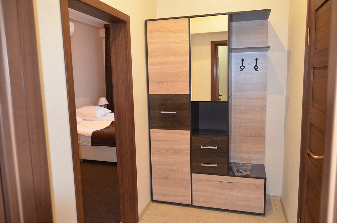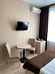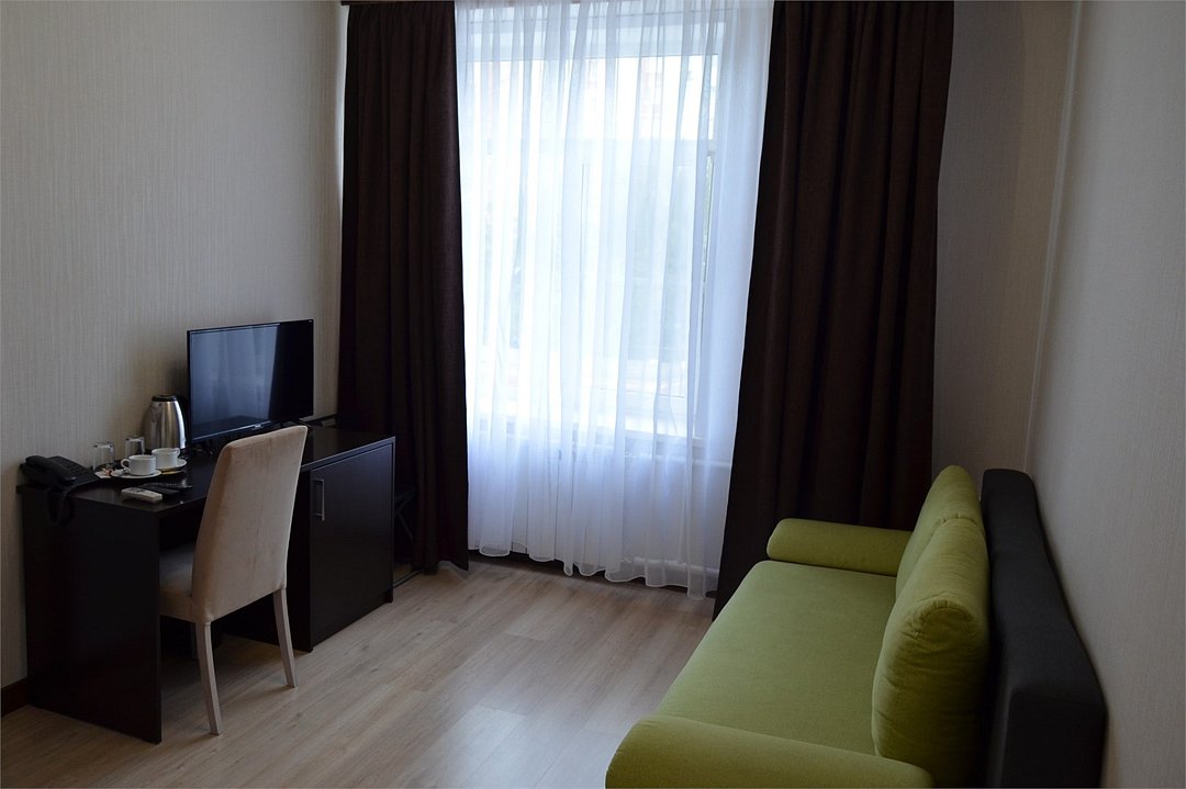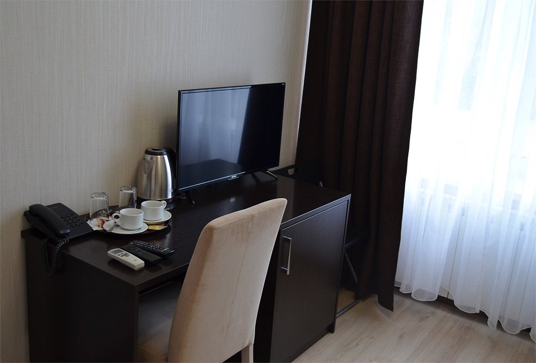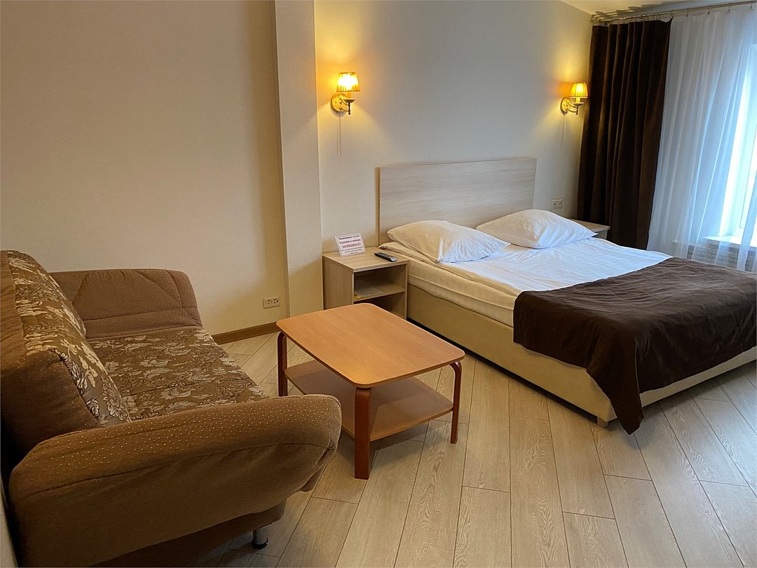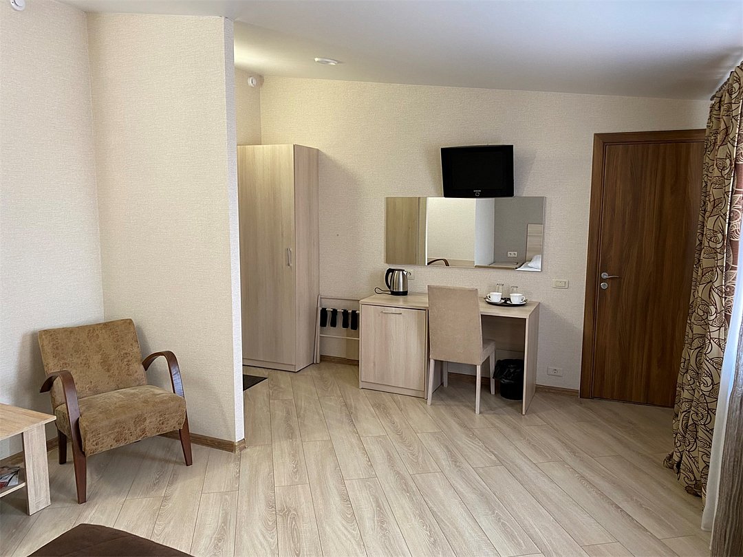 кабельное телевидение, Wi-Fi, телефон, кондиционер, ванная комната, душевая кабина, банные полотенца, тапочки, двуспальная кровать, диван, шкаф для одежды, журнальный столик, набор посуды, обслуживание номеров, чайник, кресло, вид во двор, ламинат, стаканы, столовые приборы, кофейный столик, внутренний телефон, телевизор с плоским экраном, мини-холодильник, номер для некурящих, холодильный шкаф, чайная станцияВ номере