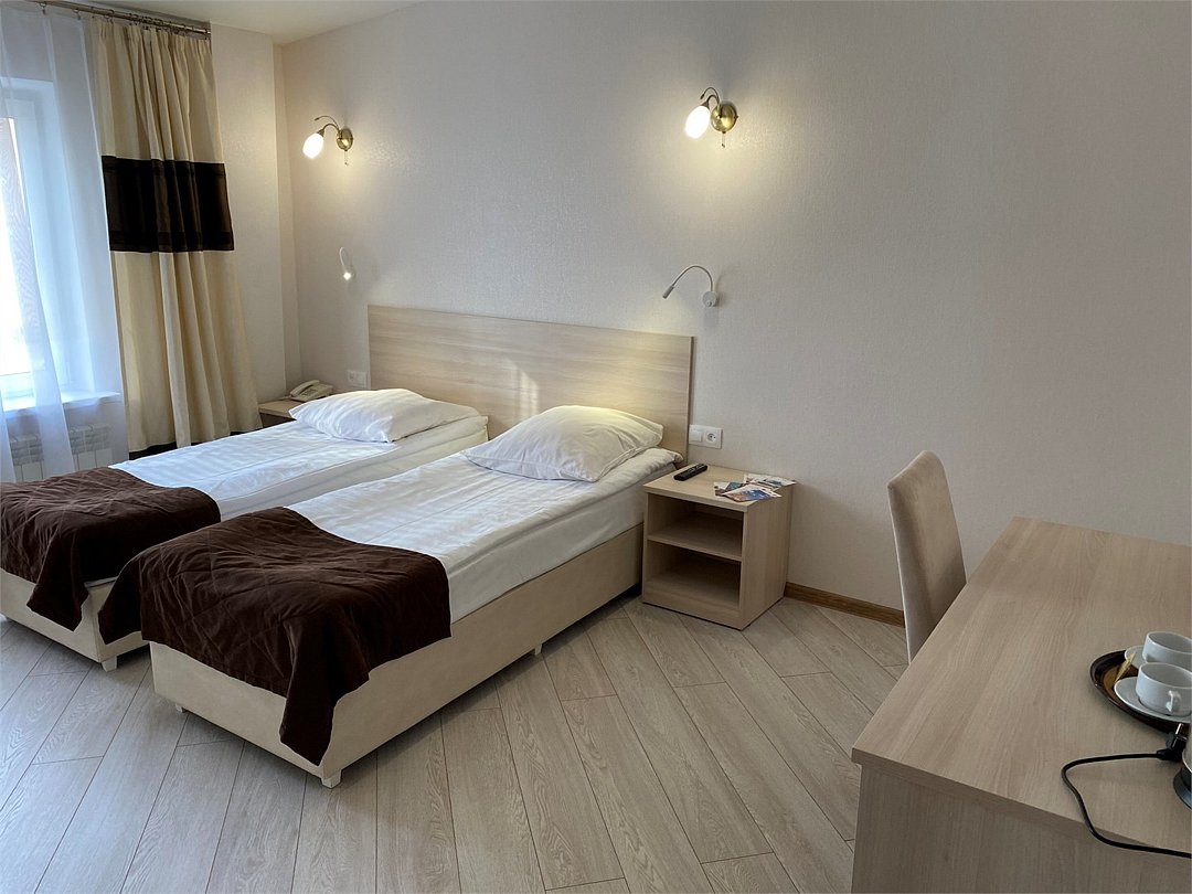 Wi-Fi, телефон, кондиционер, настольные лампы, фен, ванная комната, душевая кабина, банные полотенца, тапочки, две односпальные кровати, чайный набор, чайник, ковровое покрытие, вид во двор, ламинат, высокие потолки, туалетные средства, цифровое тв, внутренний телефон, телевизор с плоским экраном, мини-холодильник, москитная сеткаВ номере