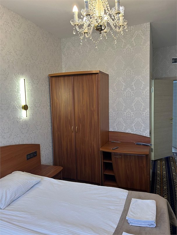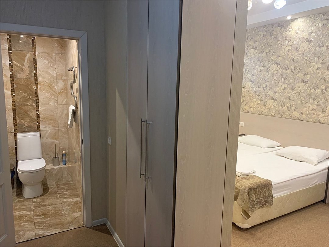 В номере есть одна большая двухспальная кровать с ортопедическим матрасом, прикроватные тумбы, шкаф, зеркало, ТВ , раздельный санузел с душевой кабиной.Услуги и удобства