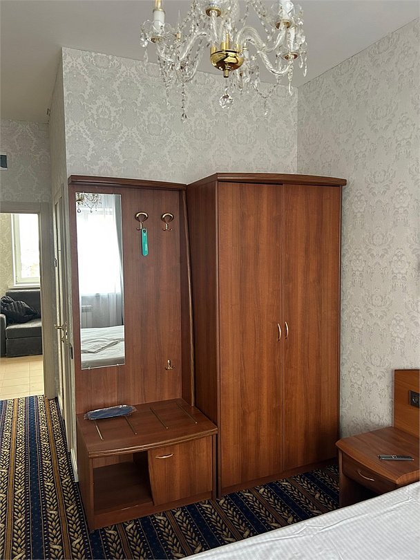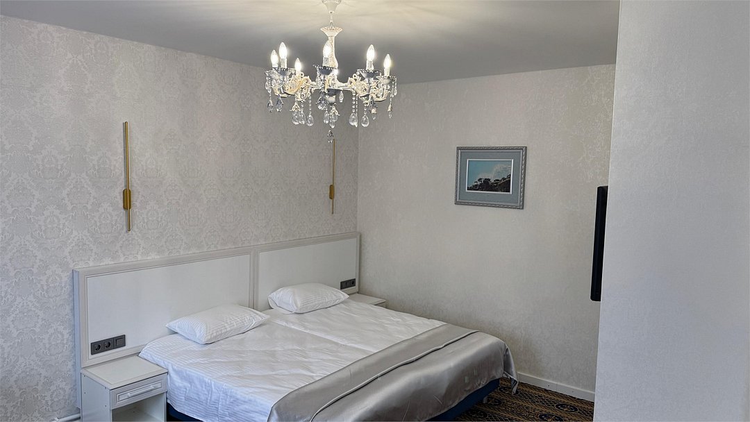 Номер с двумя раздельными комнатами. В одной комнате двуспальная кровать, телевизор, шкаф, прикроватные тумбочки. Во второй комнате две односпальные/одна двуспальная кровать, телевизор,. шкаф, багажница, журнальный столик, туалетный стол.Услуги и удобства