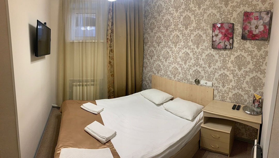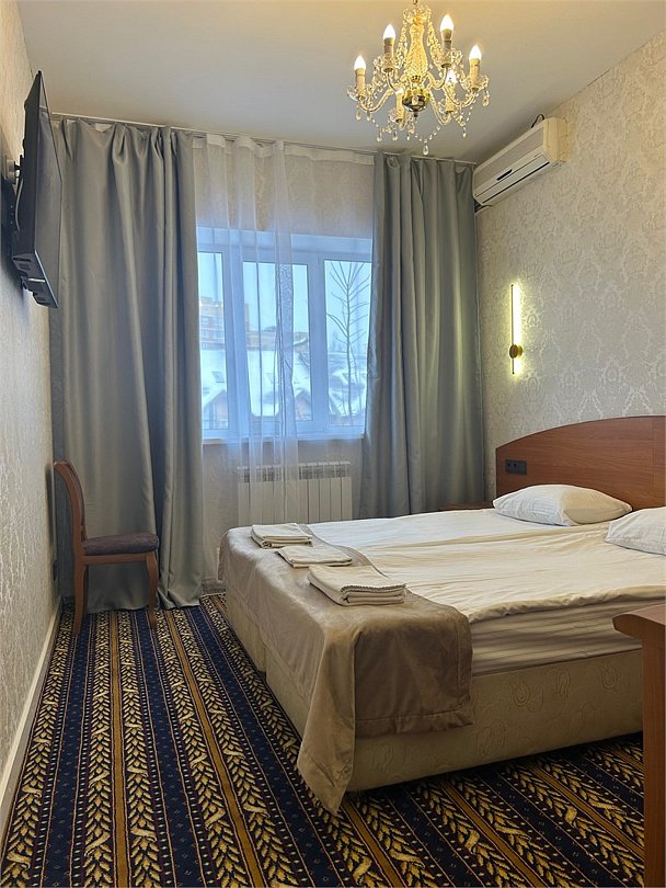 Просторный двухместный номер со свежим ремонтом площадью 20м2 с двумя односпальными спальными кроватями или одной двуспальной. В номере есть ванная комната, кондиционер, телевизор, шкаф для одежды, багажница.Услуги и удобства