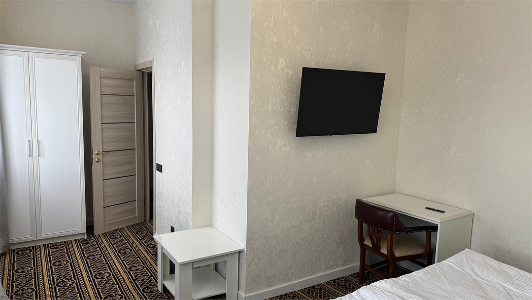 Wi-Fi, кондиционер, светильник, фен, электронные замки, ванна, банные полотенца, две односпальные или большая двуспальная кровать, тумбы, шкаф для одежды, журнальный столик, письменный стол, багажная тумба, зеркало, комод, чайный набор, чайник, унитаз, раковина, ковровое покрытие, отопление, душ, вид на город, вид во двор, высокие потолки, стаканы, тумба, туалетный столик, туалетные средства, телевизор с плоским экраном, москитная сетка, телевизор со Smart TV, вешалки-плечики, мыло, можно с питомцами, Android TVВ гостиничном номере