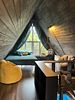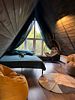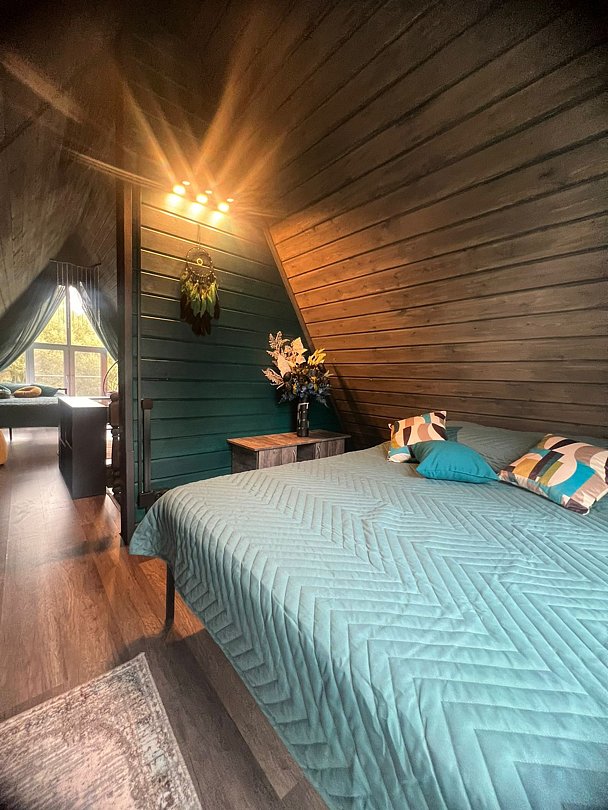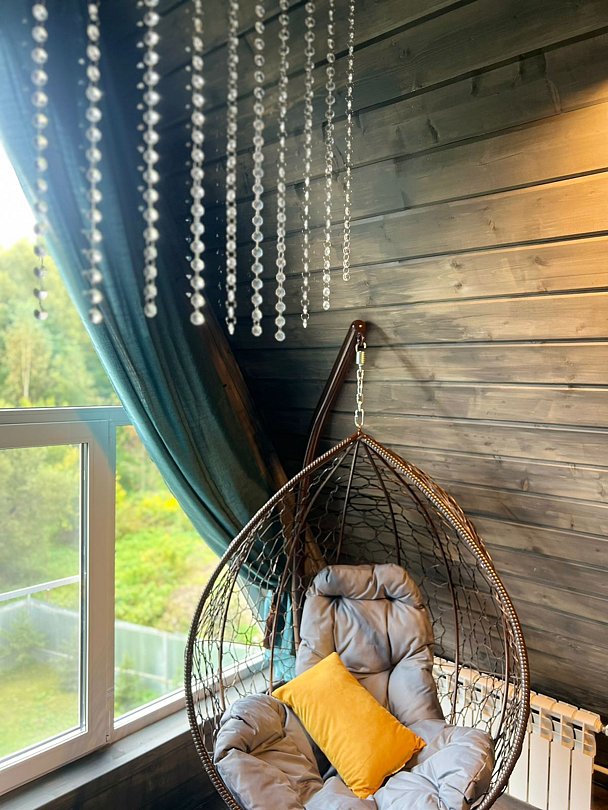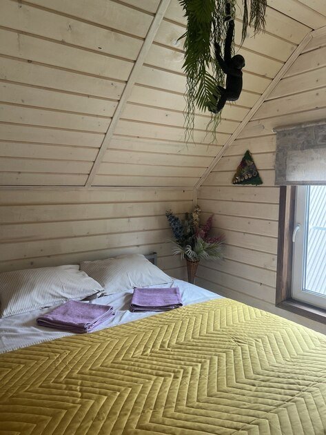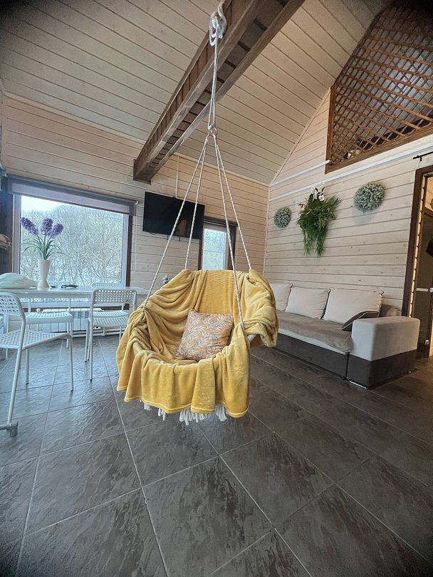 На первом этаже отдельная комната с удобным двухспальным диваном. На втором этаже две комнаты с большими кроватями 180х200 с матрасами Bluesleep для максимально крепкого сна. Подвесные качели и лаунж-зона с удобными пуфами для досуга и настольных игр. Для седьмого человека предоставляем большую раскладушку.