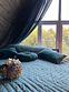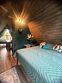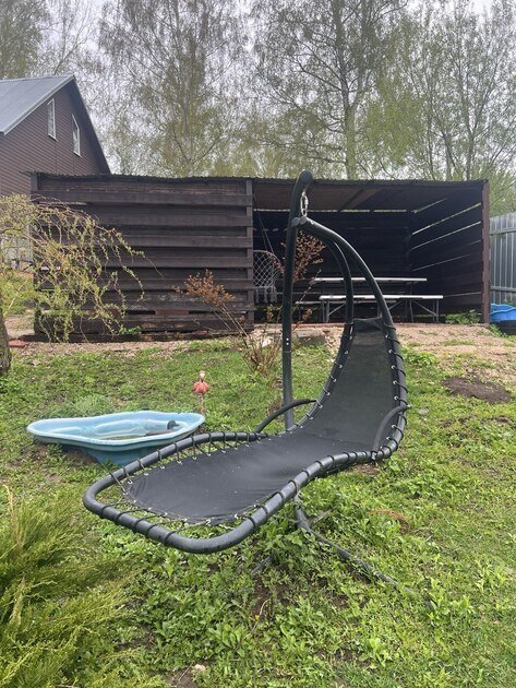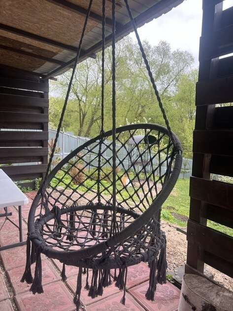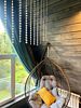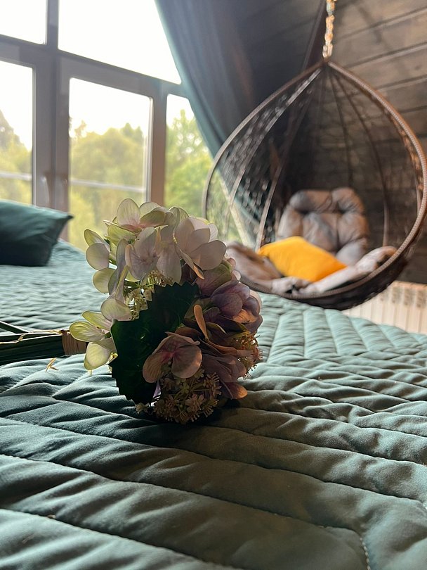 На первом этаже удобный диван и подвесной гамак-кресло, на втором этаже большая кровать сто восемьдесят на двести с матрасом Bluesleep для максимально крепкого сна.