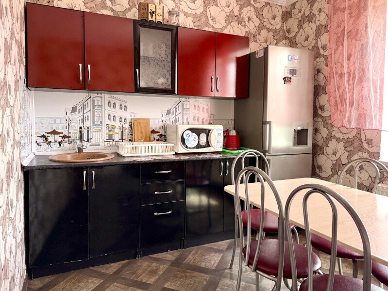 В доме в общем доступе имеется гостиная с кухонной зоной, где есть вся необходимая мебель, столовые приборы и техника.