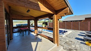Во дворе коттеджа индивидуальный бассейн с подогревом и гидромассажем, также мангальная зона и зона отдыха, и все это с видом на озеро!