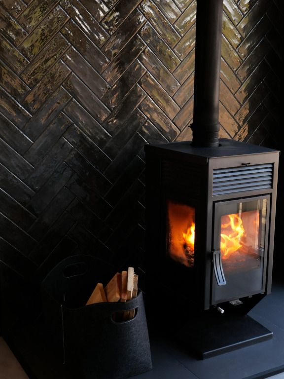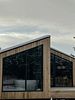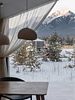 Просторный дом с камином в стиле barn house, с панорамными окнами и видом на горы.