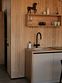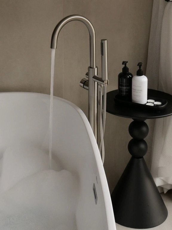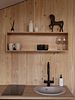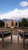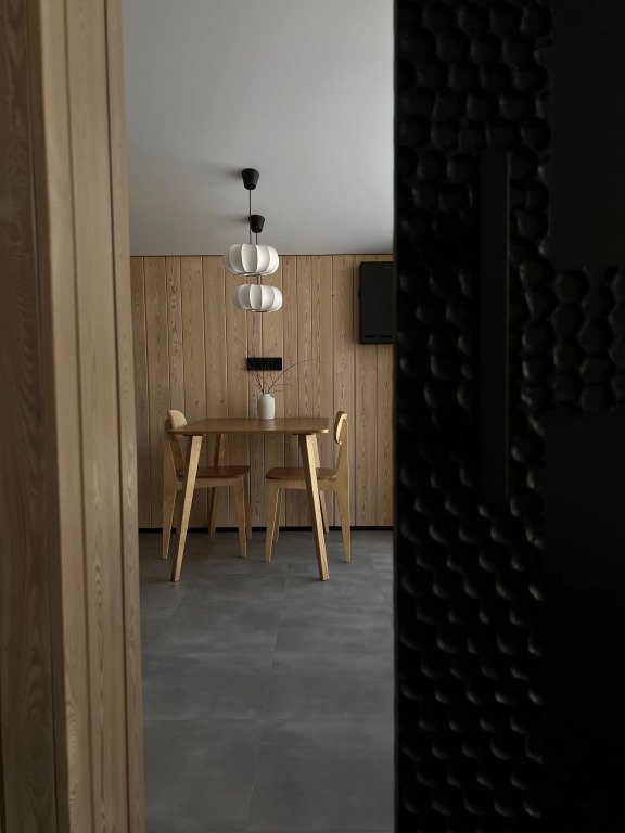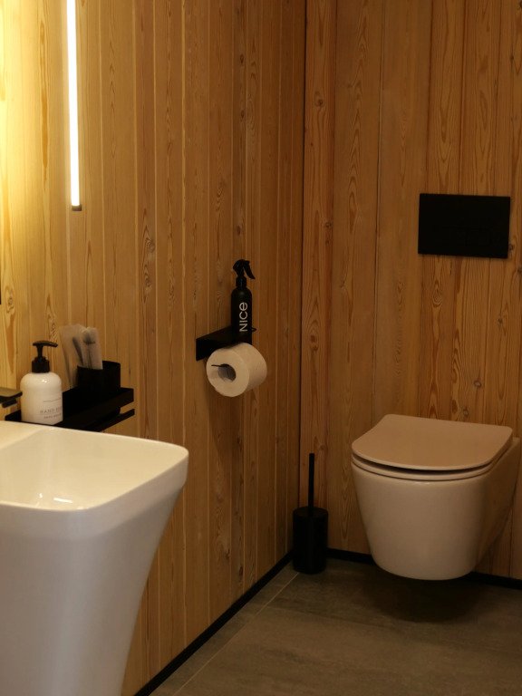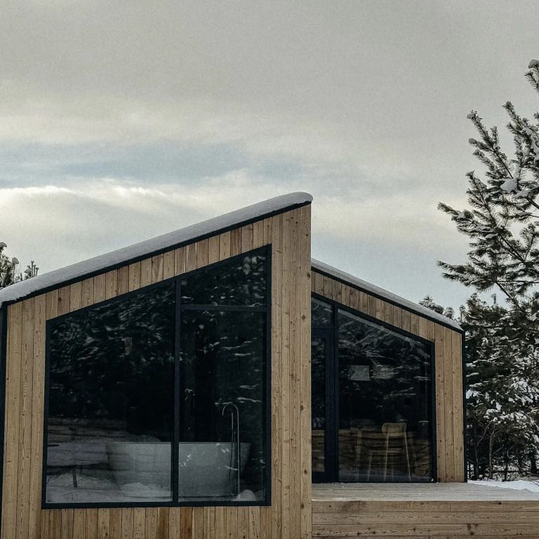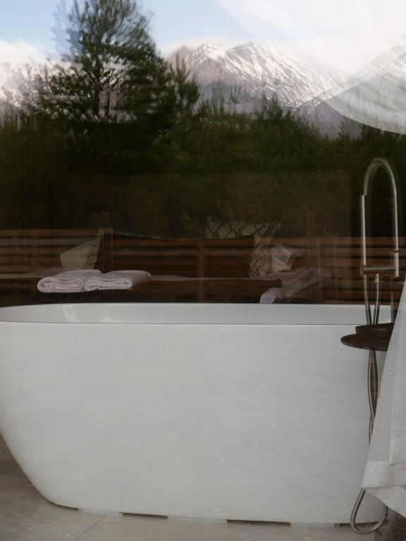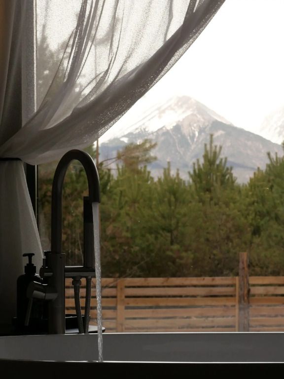 Дом с ванной, расположенной прямо у панорамного окна с видом на горы. В дому две отдельные комнаты: гостевая и спальня с ванной, есть зона кухни и гардеробной, а также просторный санузел.