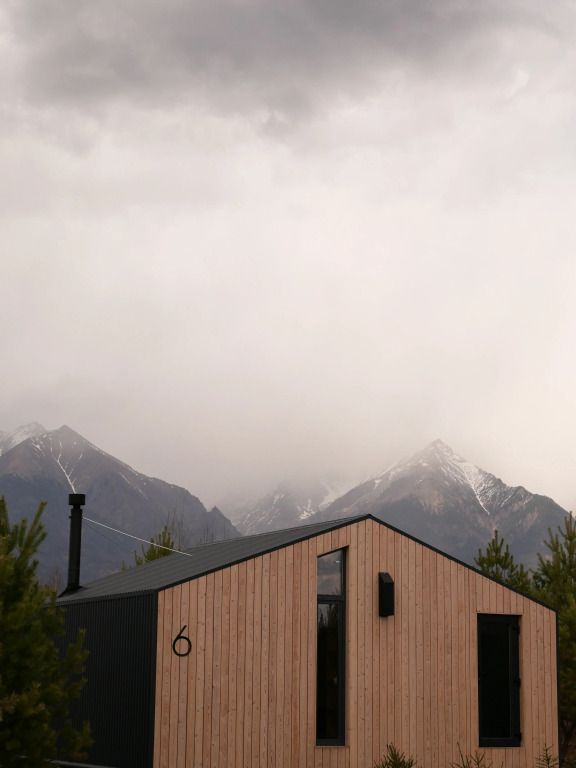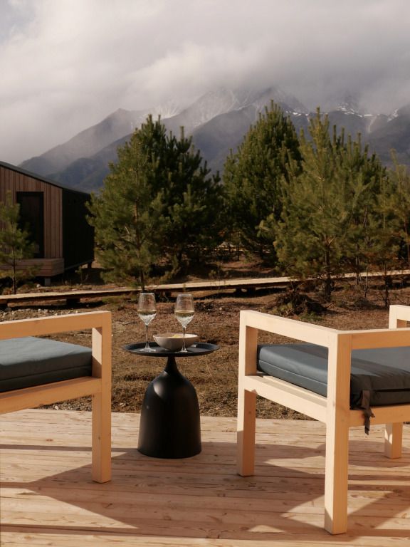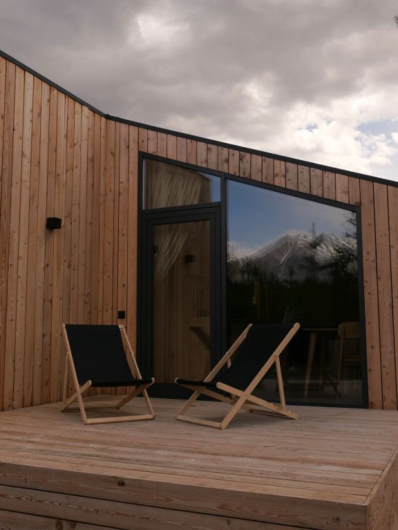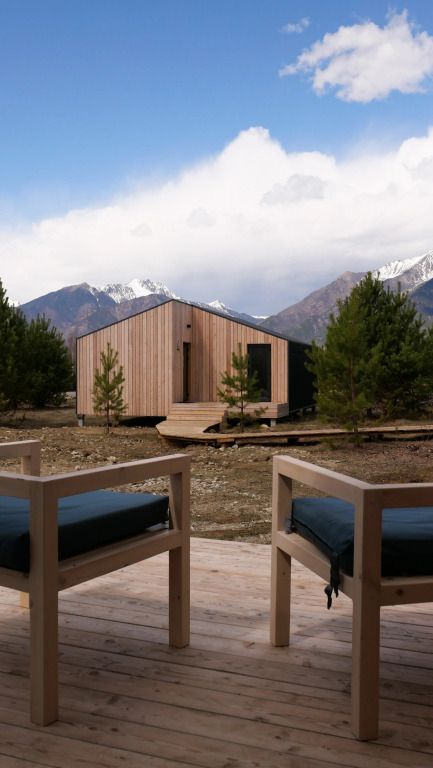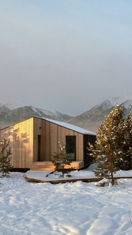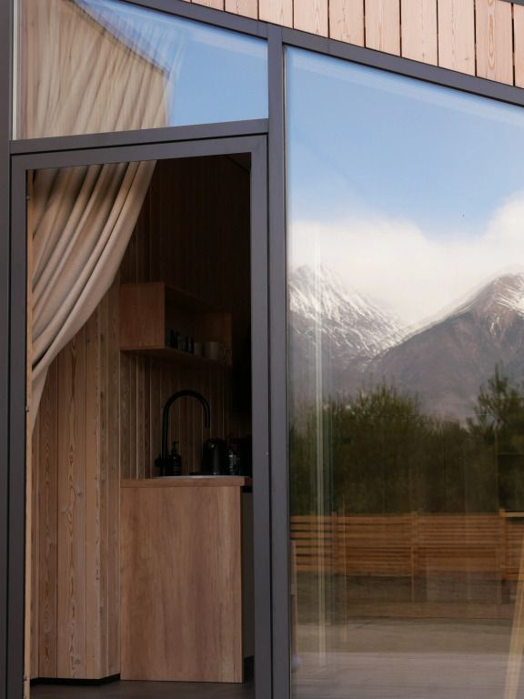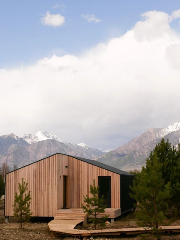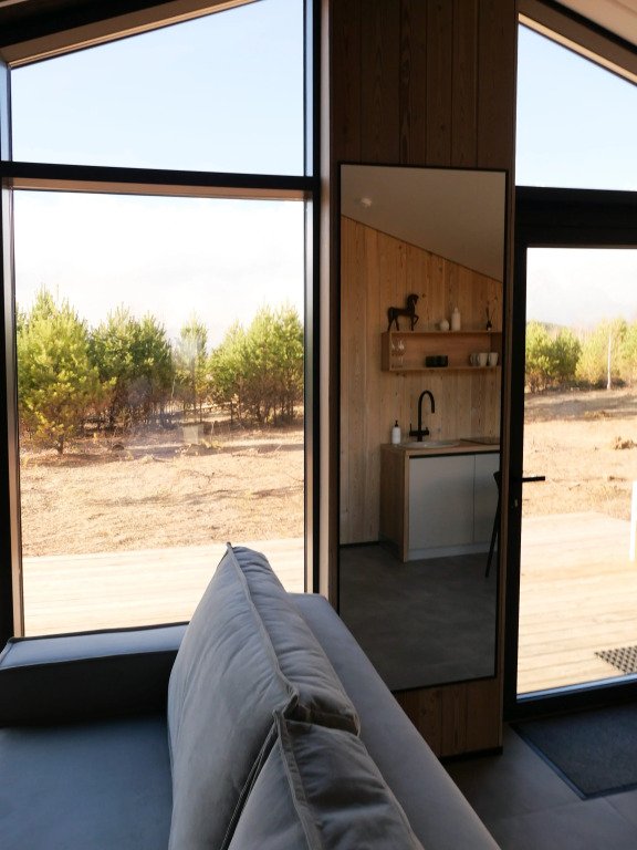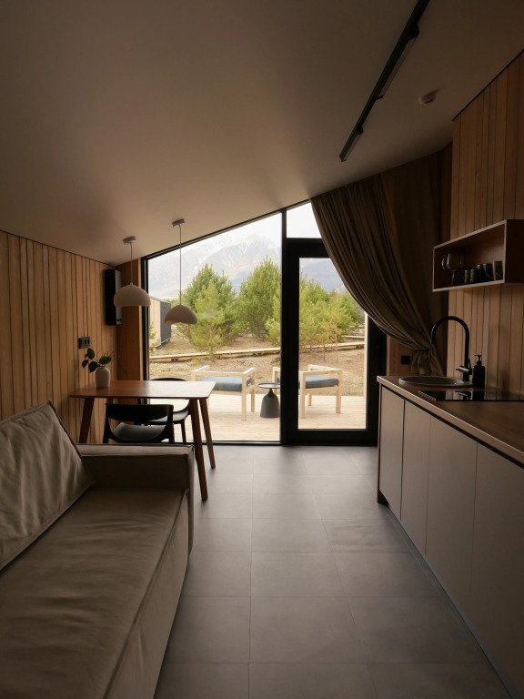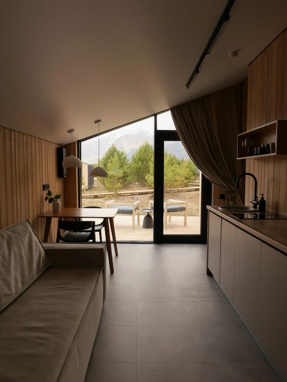 Уютный дом с панорамными окнами и видом на горы. В доме две отдельные комнаты, гостевая и спальня, есть зона кухни и гардеробной, а также просторный санузел.