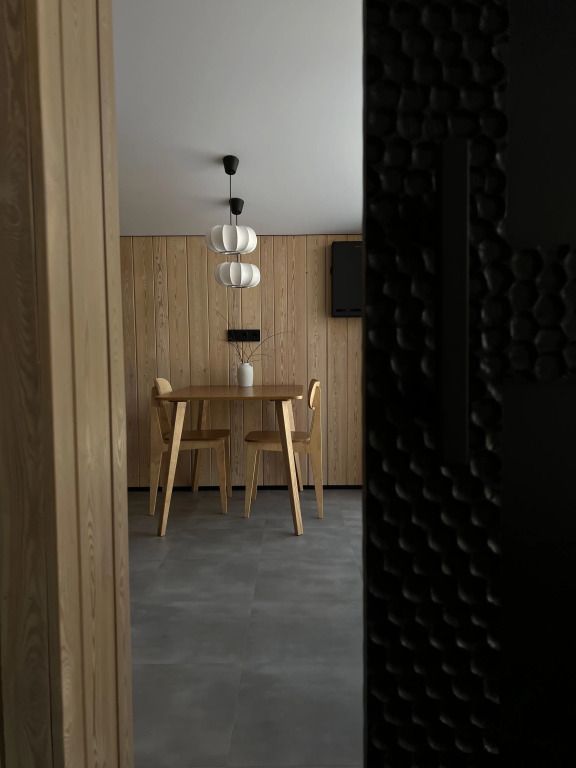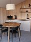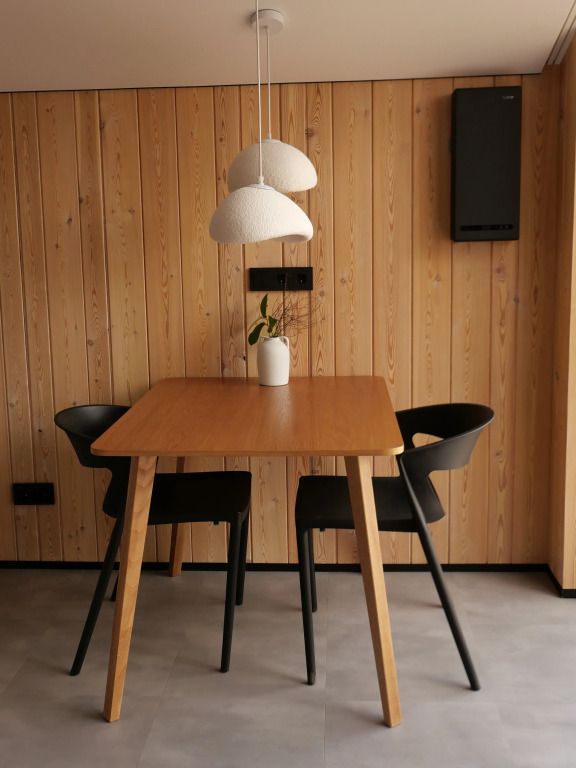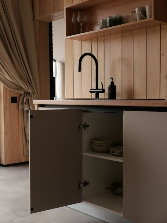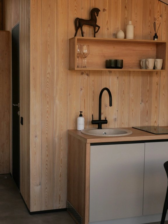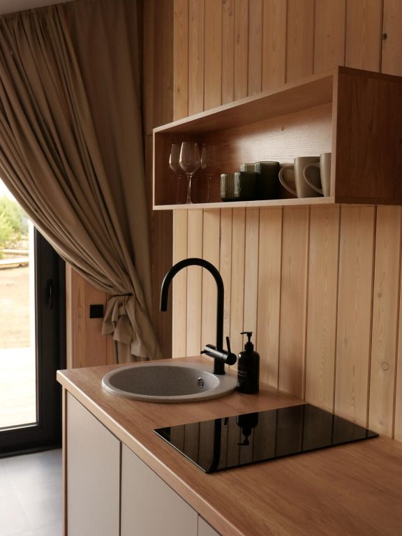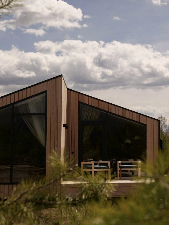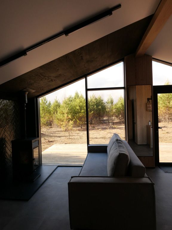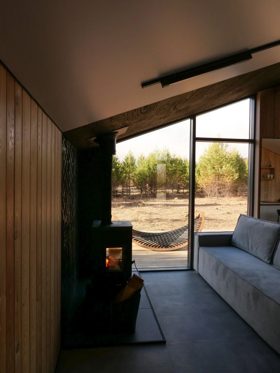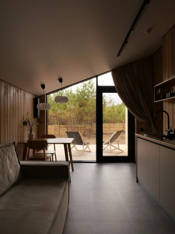 Уютный дом с панорамными окнами и видом на горы. В доме две отдельные комнаты, гостевая и спальня, есть зона кухни и гардеробной, а также просторный санузел.
