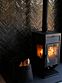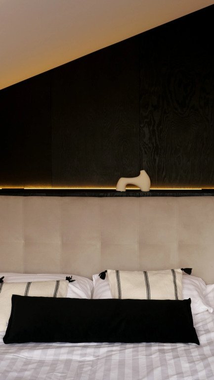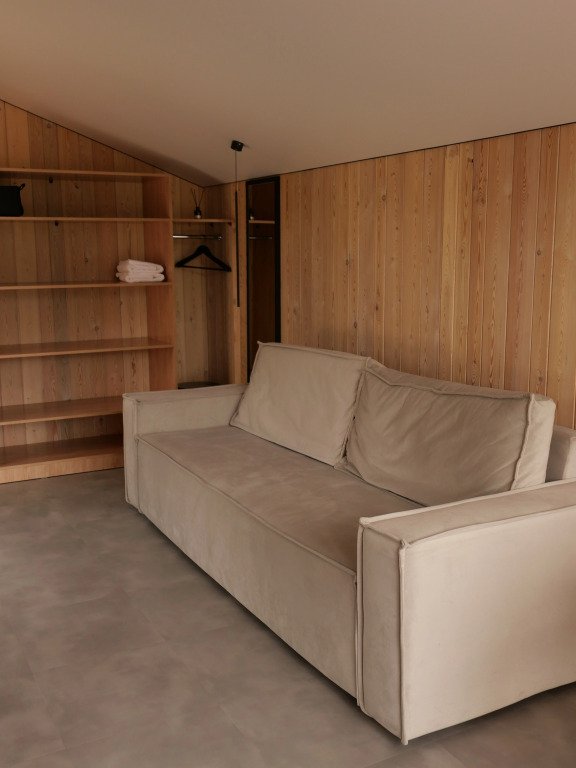 В едином пространство с высоким потолком расположена гостевая зона с камином, спальня, есть зона кухни и гардеробной, а также санузел