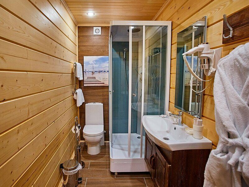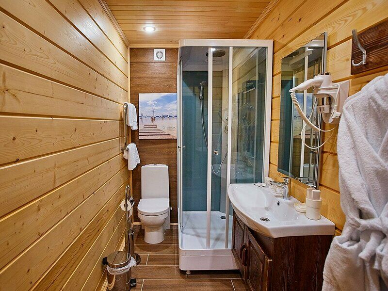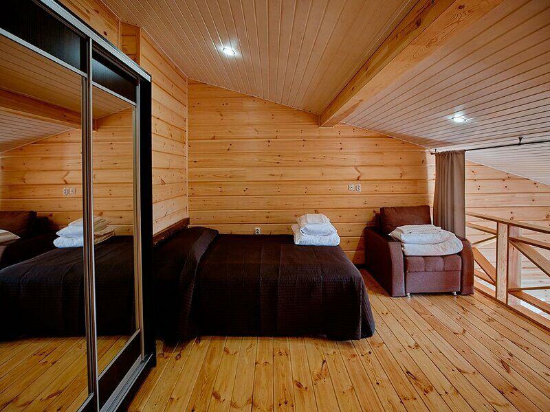 47 кв.м, просторная гостиная с кухонной зоной (плита, холодильник, посуда), телевизор, телефон, сейф, мини-бар и wi-fi. Уютная спальня на втором этаже с двуспальной кроватью и креслом-кроватью. Санузел с душевой кабиной, тёплым полом, фен.