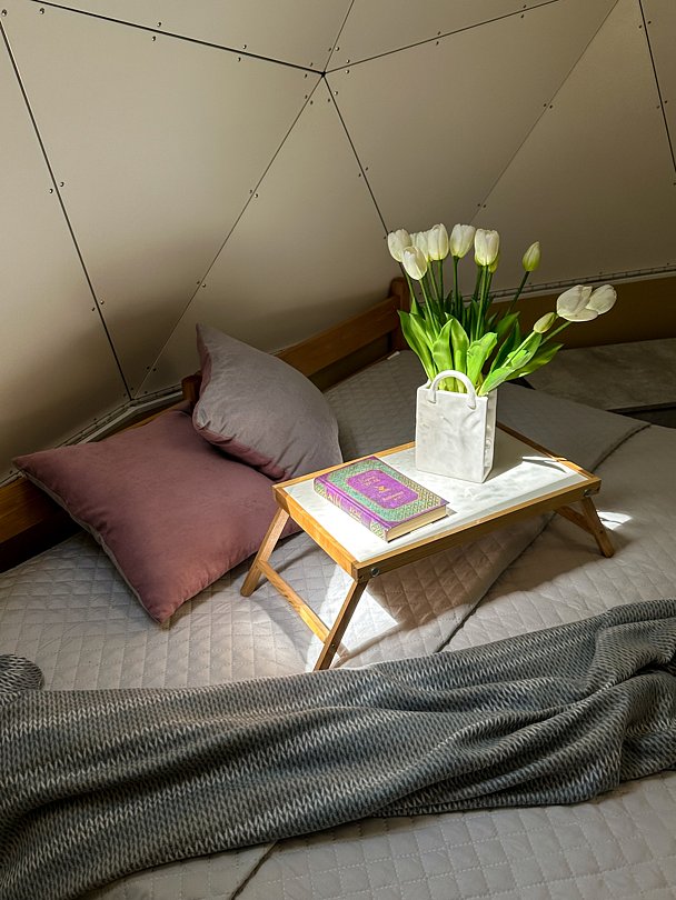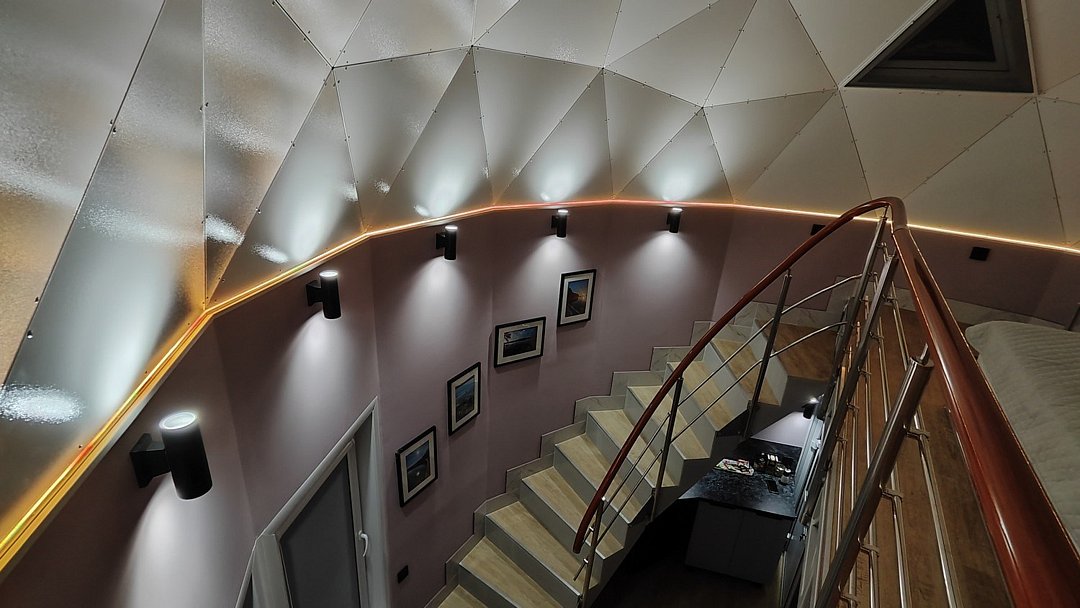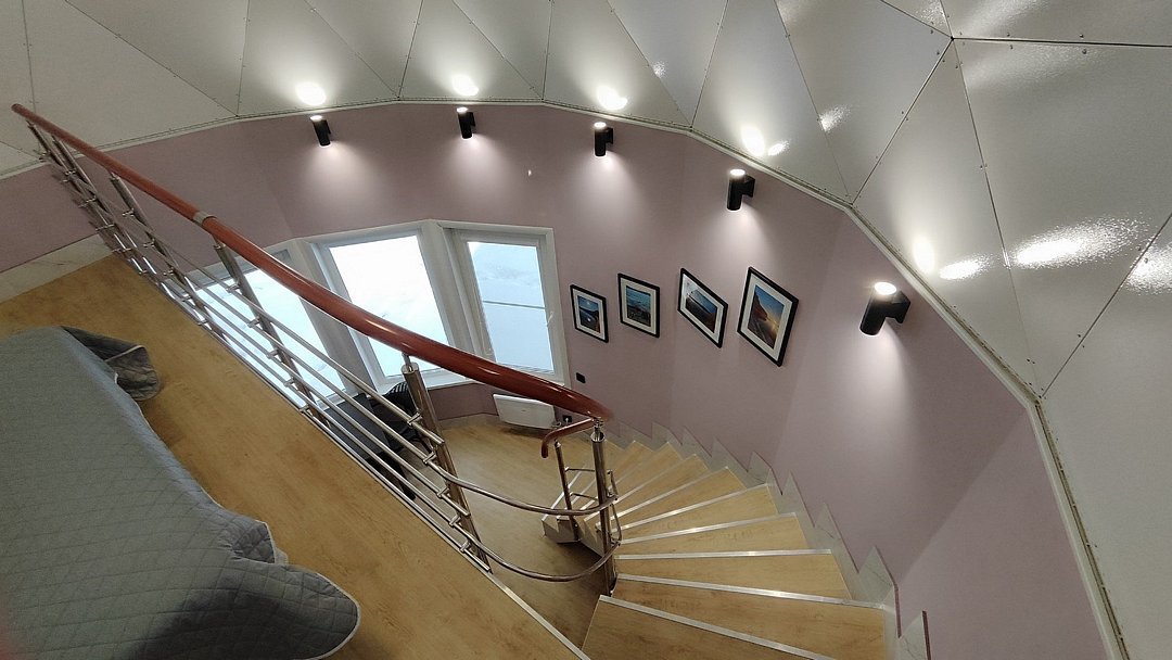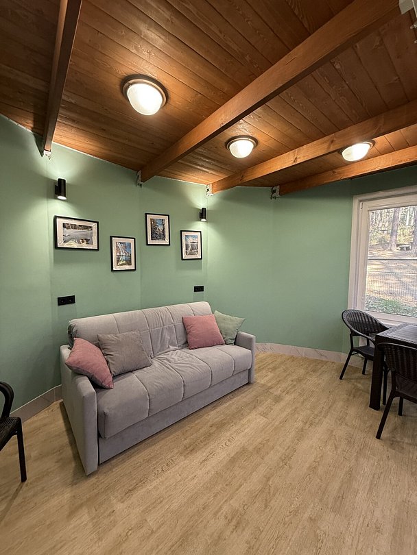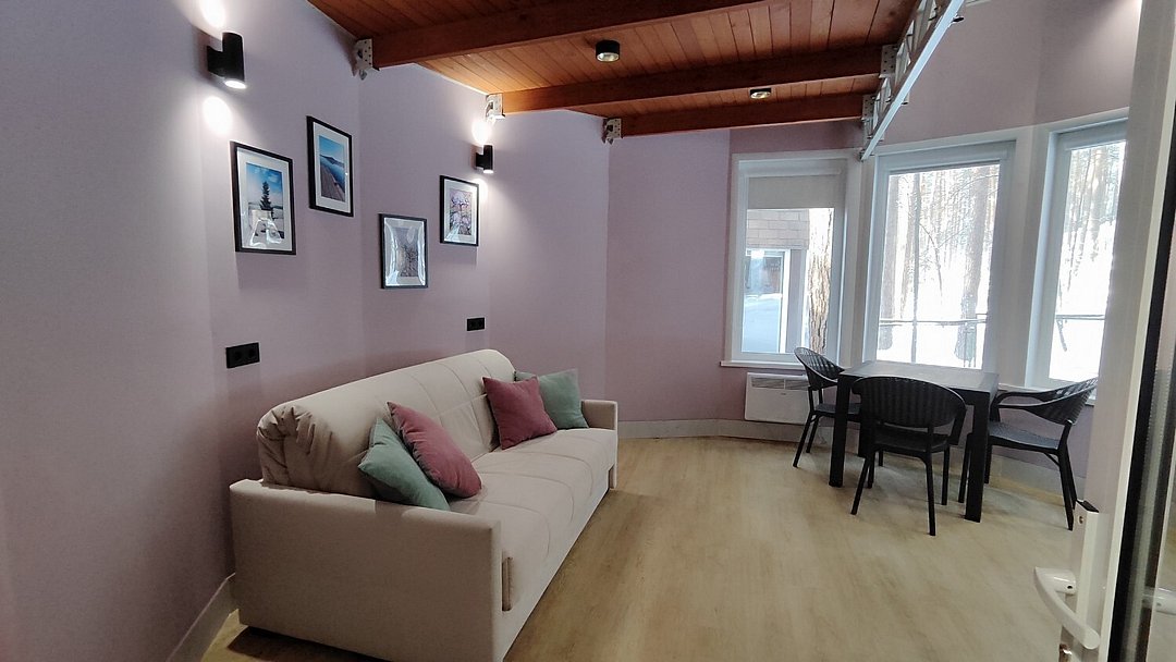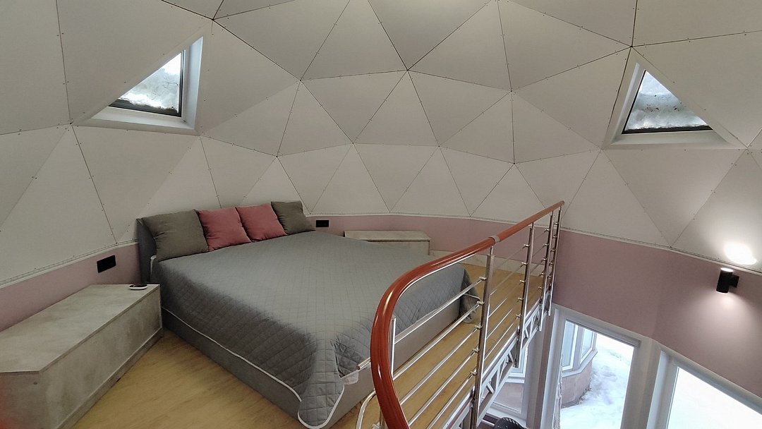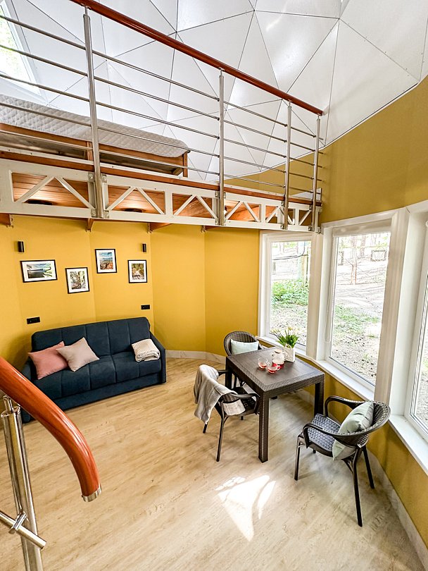 Внутри каждого домика предусмотрены все удобства для комфортного проживания. Гостиная с ортопедическим двуспальным диваном и обеденной зоной оборудована всем необходимым: от холодильника до посудомоечной машины. Кухня оснащена современными приборами и кухонными принадлежностями, что позволяет готовить любимые блюда с легкостью. На мансарде находится полноценное место для отдыха с купольной крышей и мансардными окнами, наполняющими пространство естественным светом.