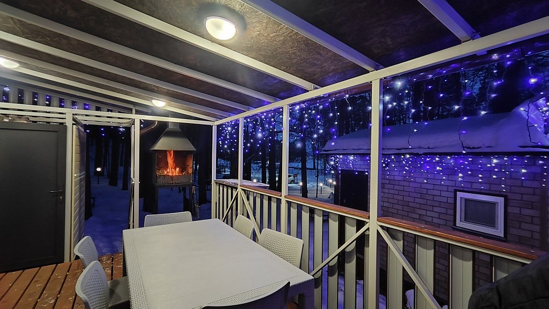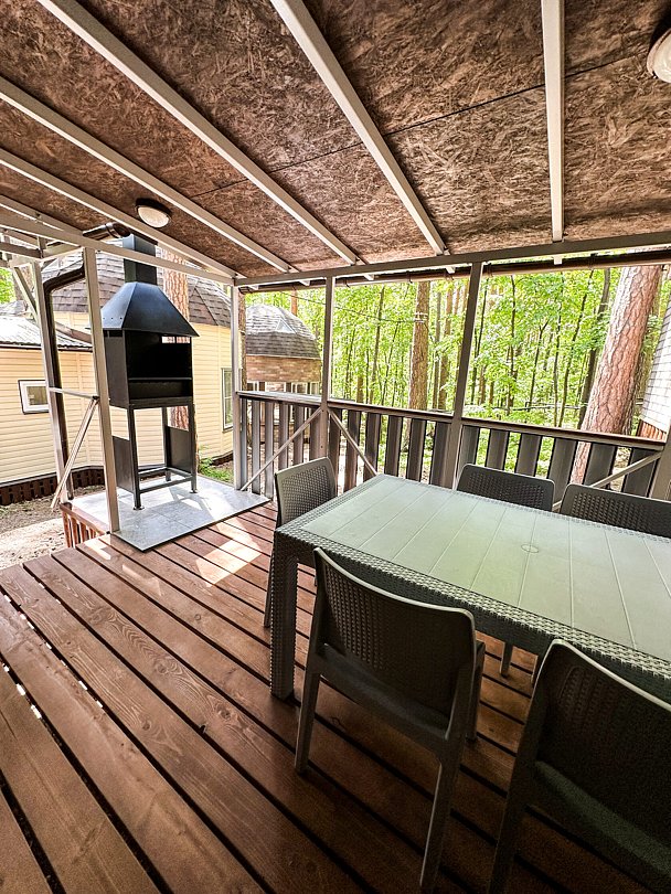 На просторной веранде оборудован мангал и уютная обеденная зона, где можно приготовить ароматные блюда и насладиться ими в кругу близких. Здесь гости отдыхают за столом, наслаждаясь тишиной и свежим лесным воздухом.
