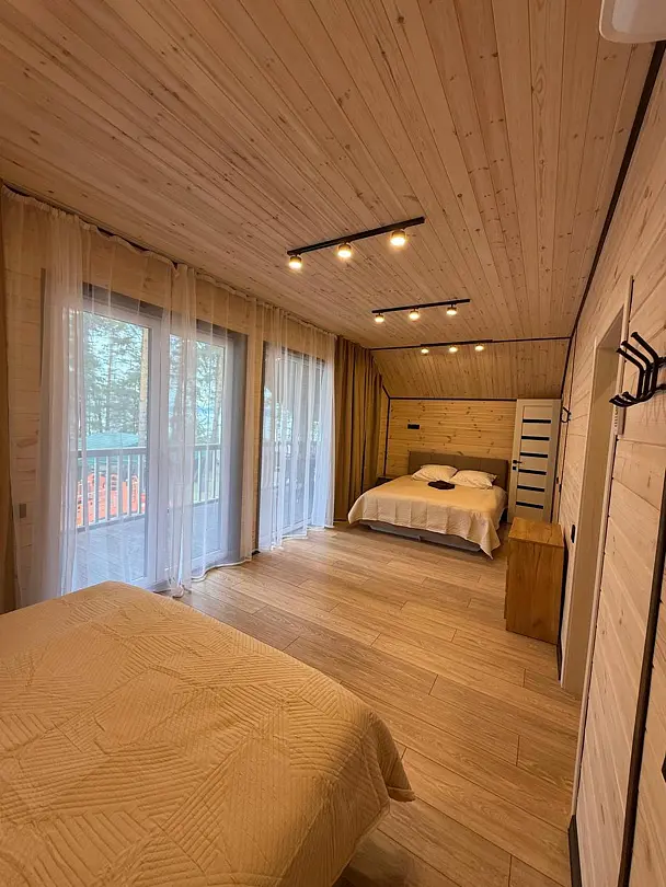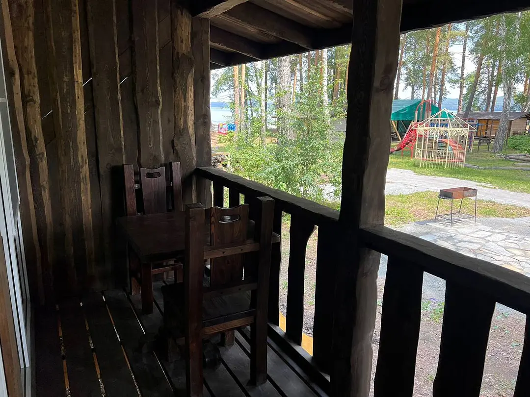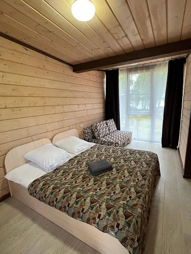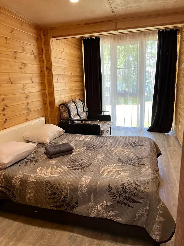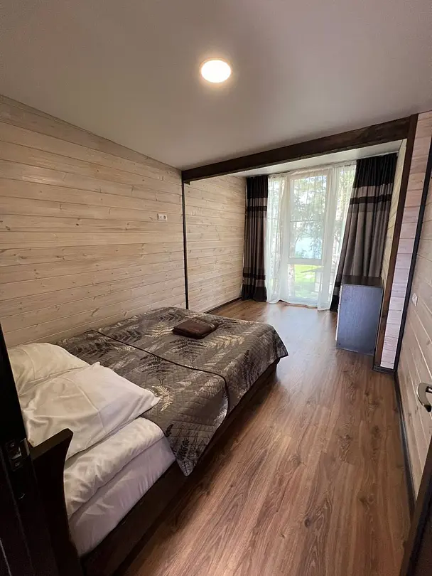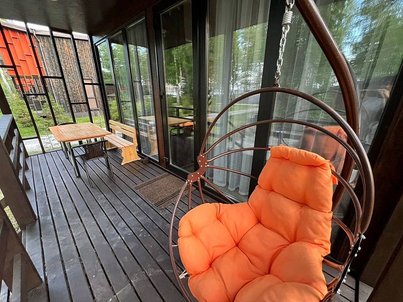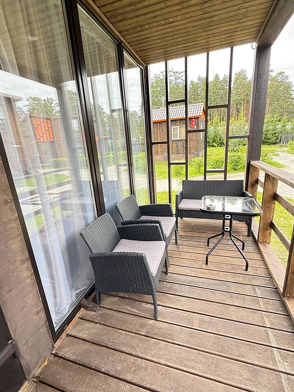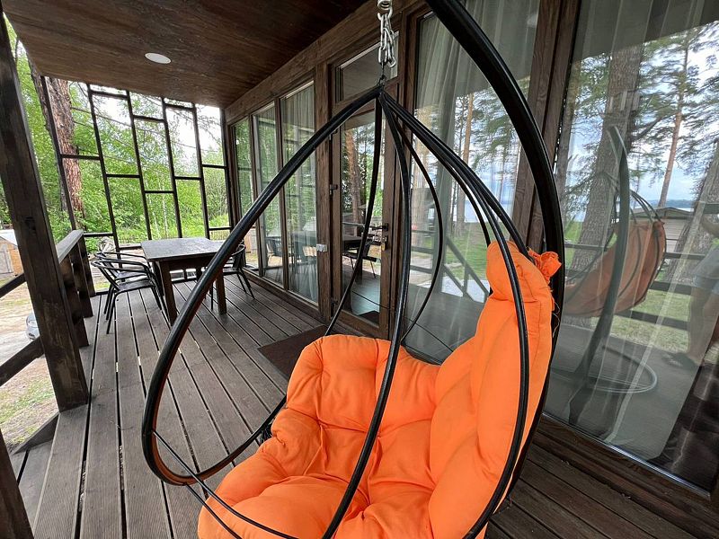 Панорамные окна в пол. До озера 100 м. Возле шале есть 2 лежака.