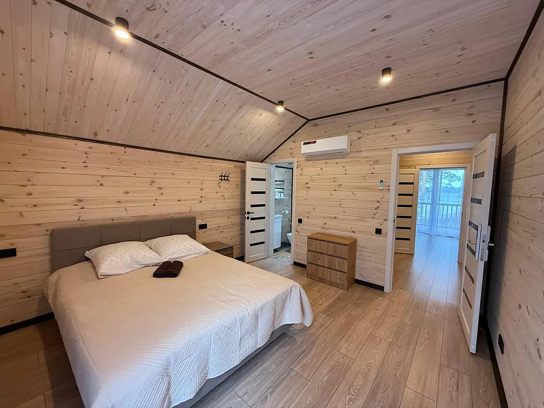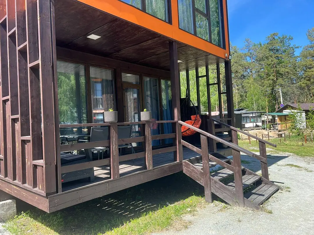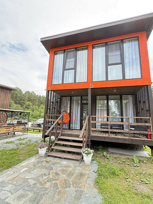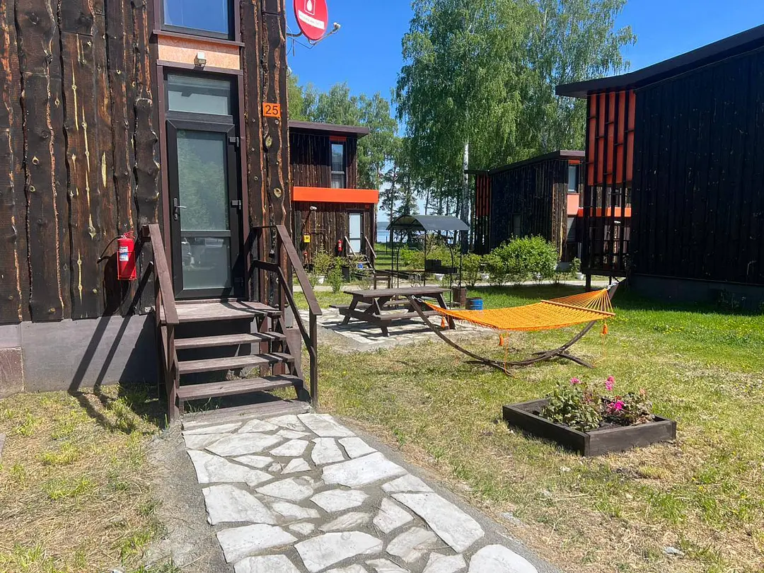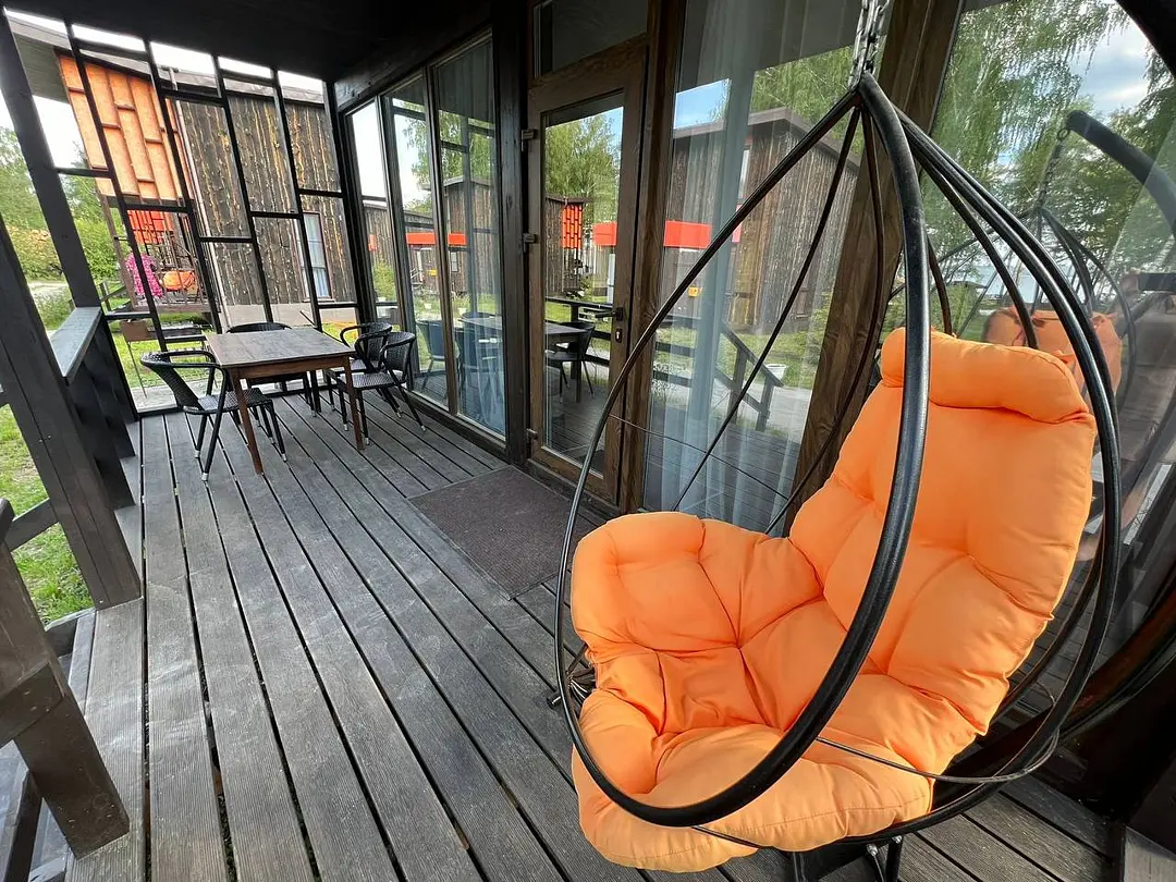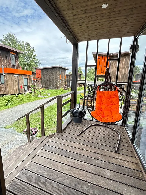 Панорамные окна в пол. До озера 100 м. Возле шале есть 2 лежака.