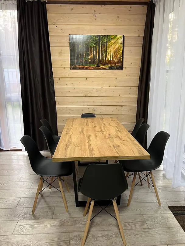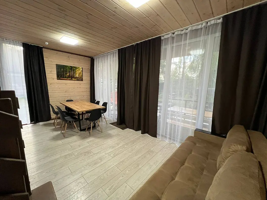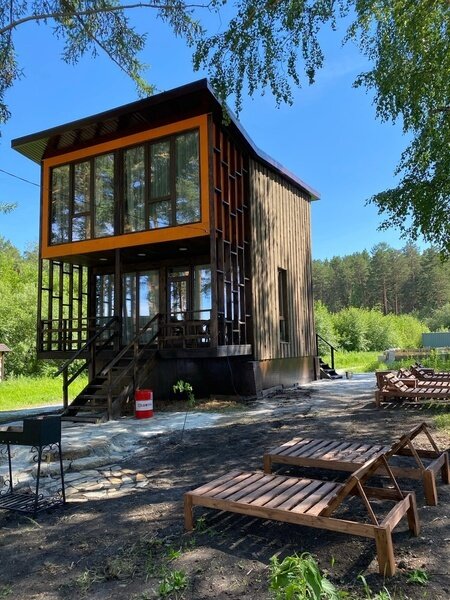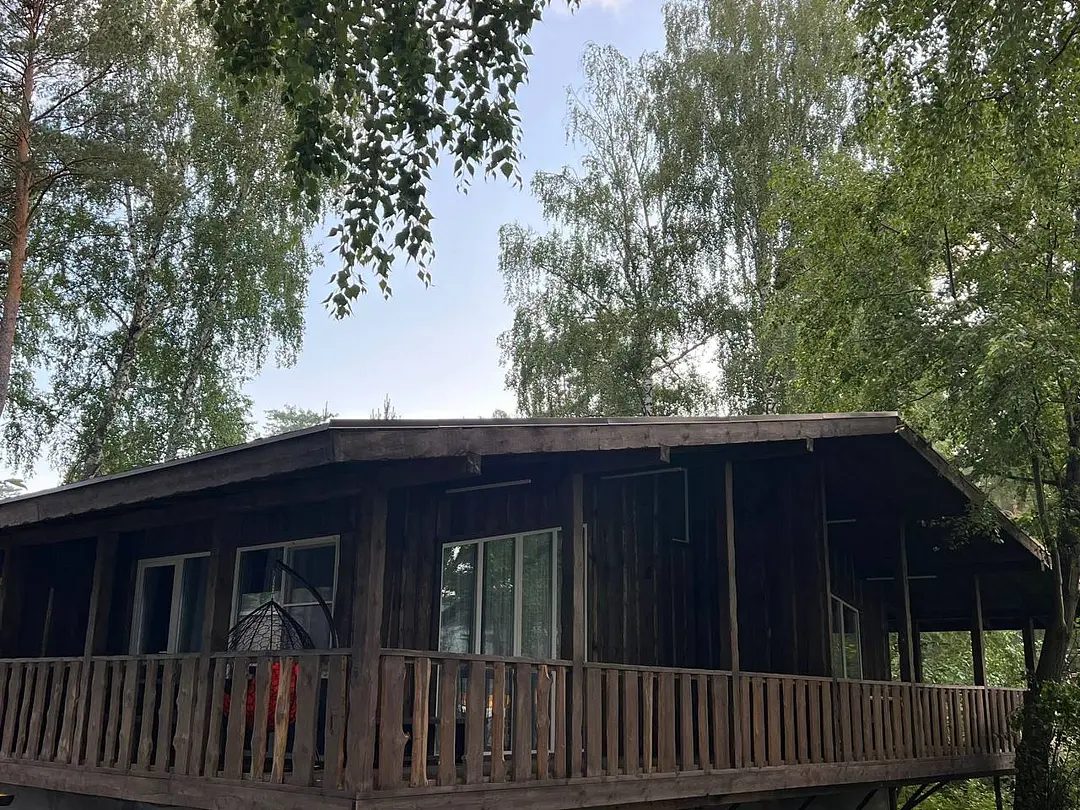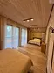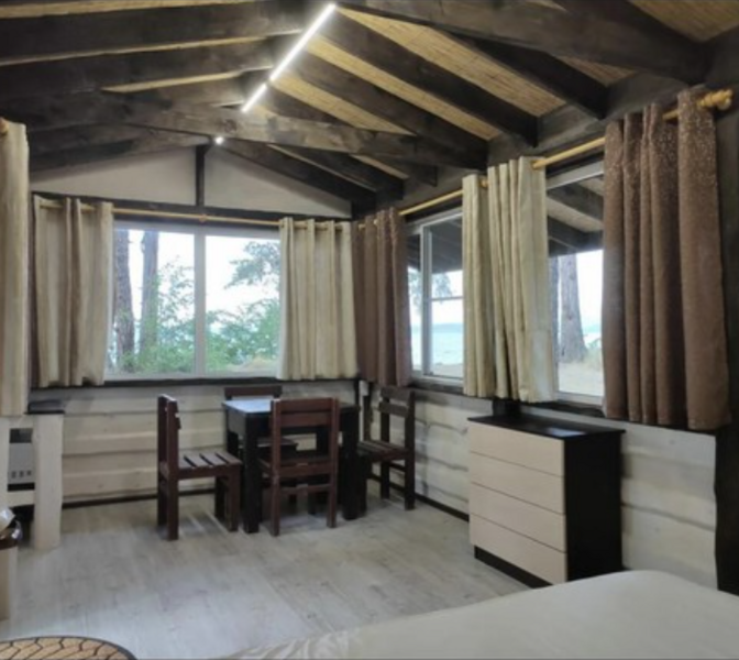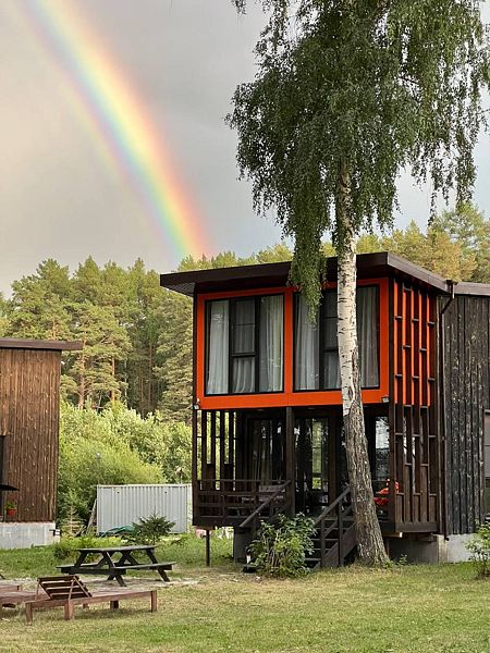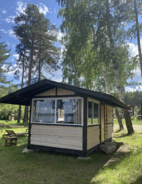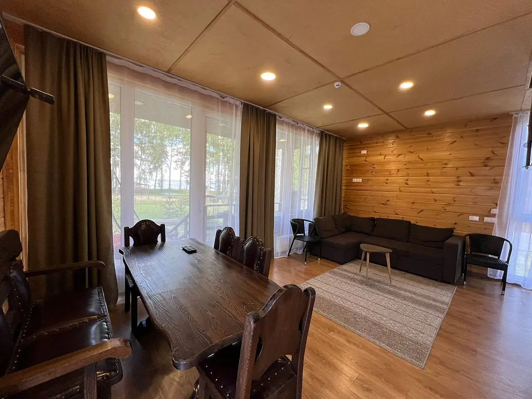 Панорамные окна в пол. До озера 100 м. Возле шале есть 2 лежака.