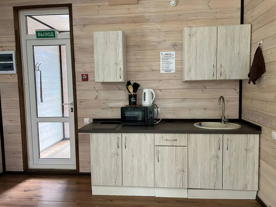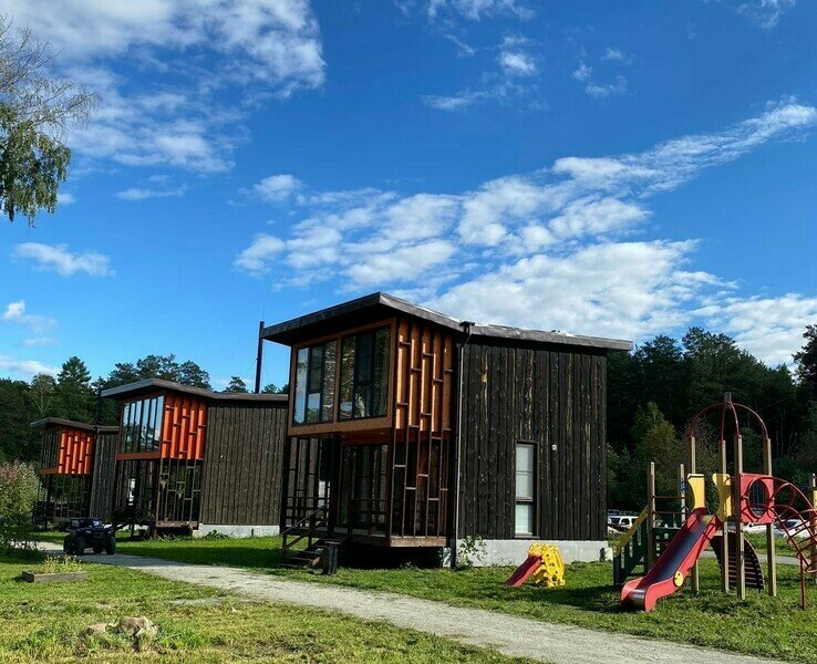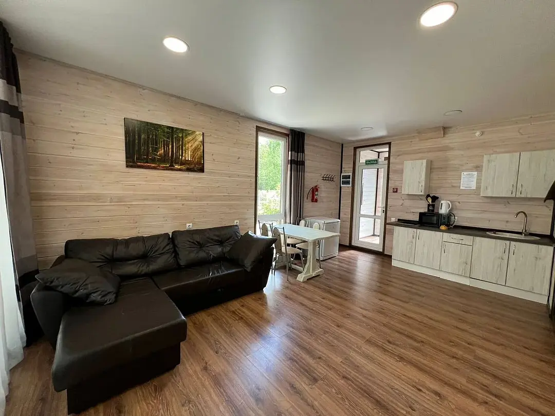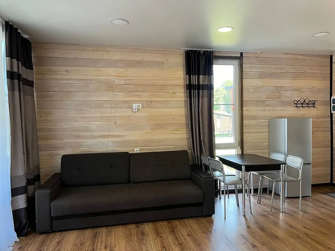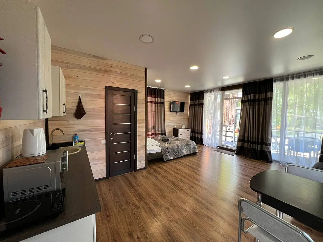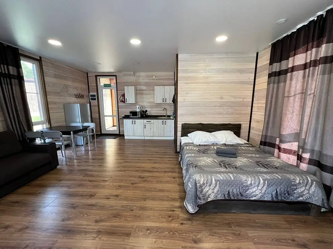 Семейный отдыхДостоинстваДомики новые. Еще есть запах свежего дерева и новой мебели. Всё как на фото в домике. Есть вся посуда для сервировки и приготовления пищи, но мы не пользовались, тк в местном кафе заказывали на вынос. Кстати: все по домашнему вкусно.