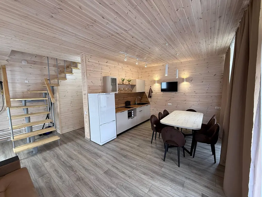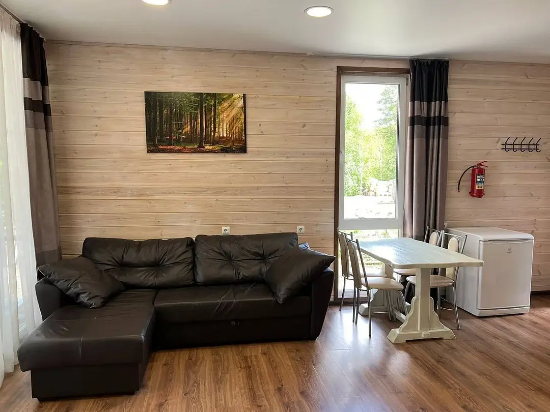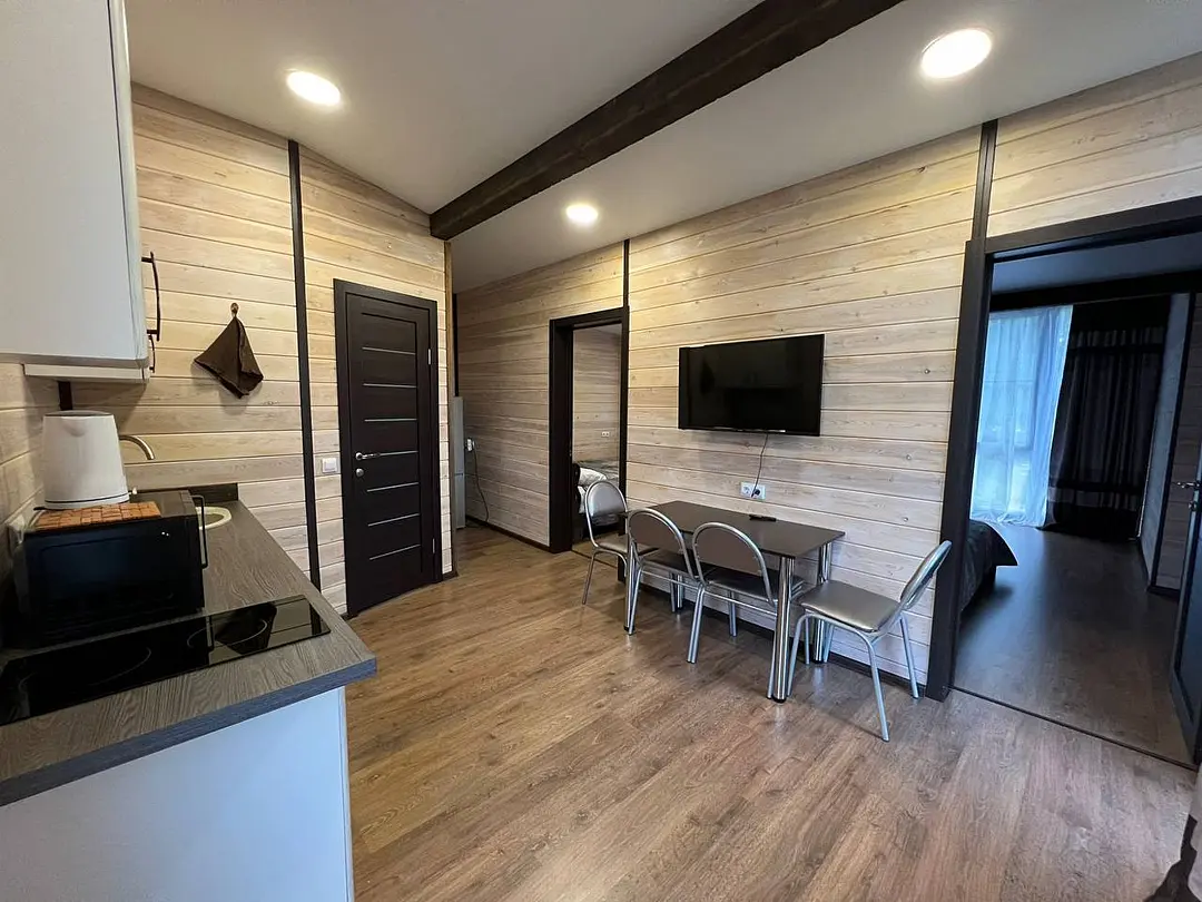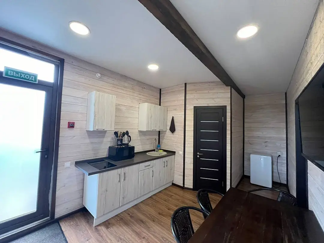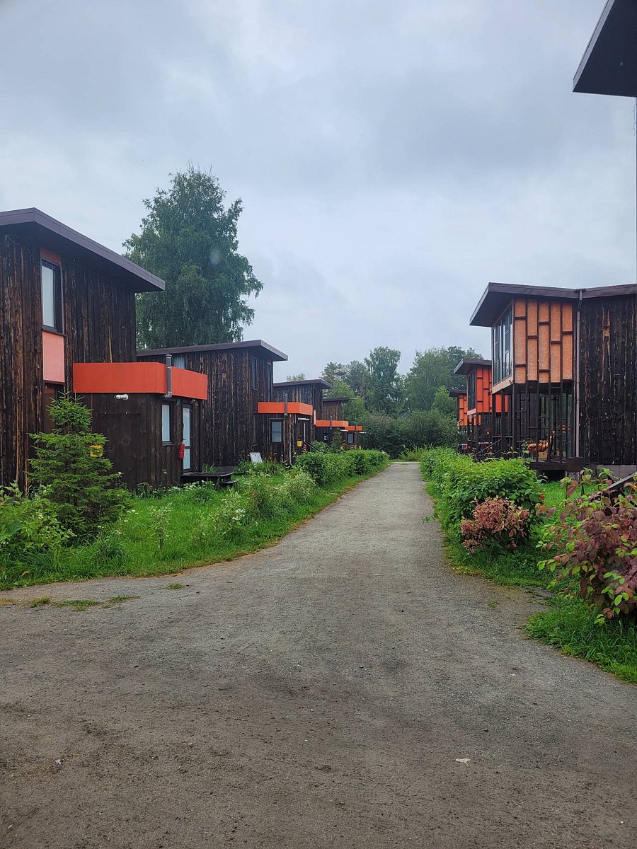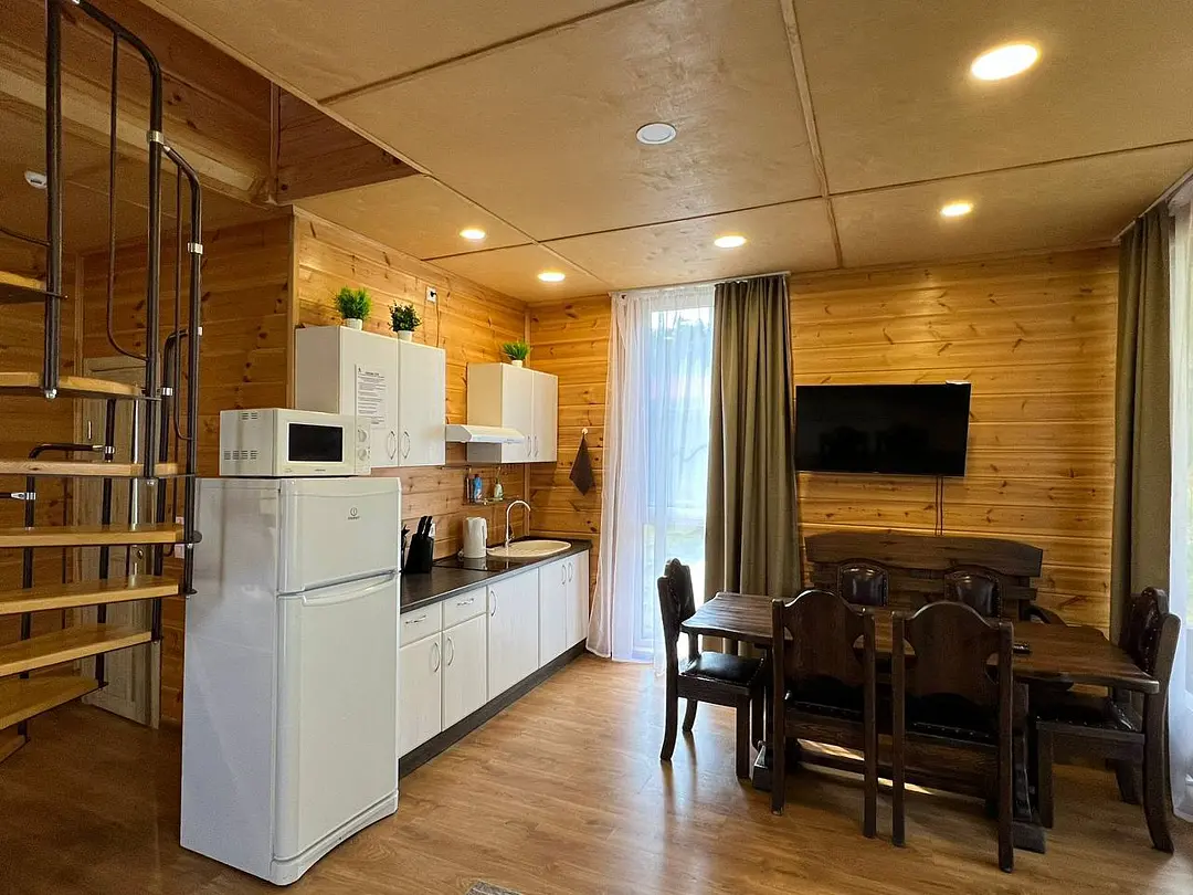 Семейный отдыхДостоинстваДомики новые. Еще есть запах свежего дерева и новой мебели. Всё как на фото в домике. Есть вся посуда для сервировки и приготовления пищи, но мы не пользовались, тк в местном кафе заказывали на вынос. Кстати: все по домашнему вкусно.