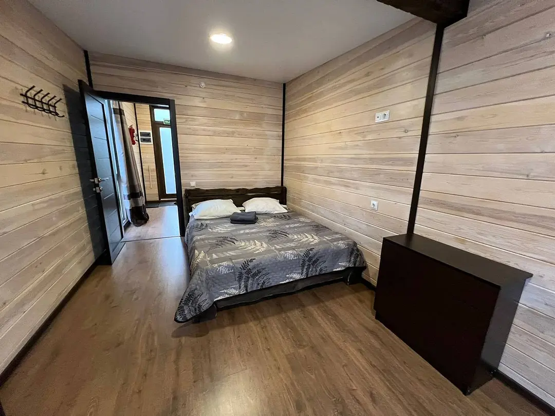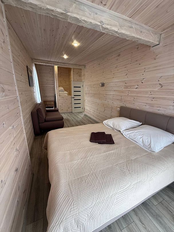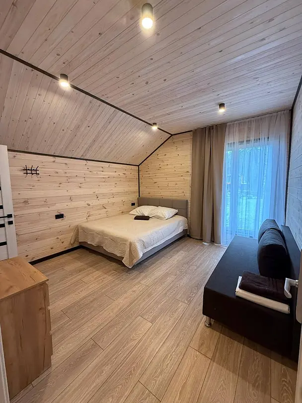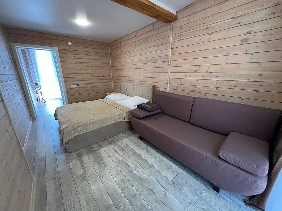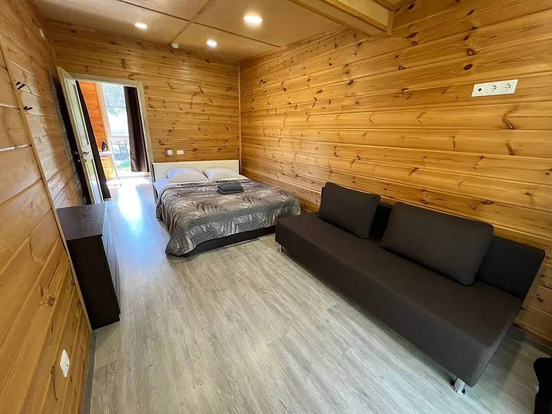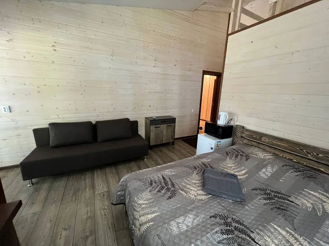 В номере: кровать и диван, ТВ, чайник, холодильник, микроволновая печь, душ, туалет, балкон, мангальная зона.