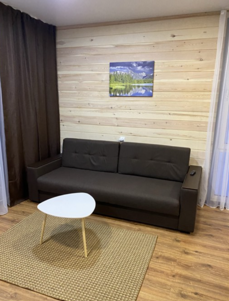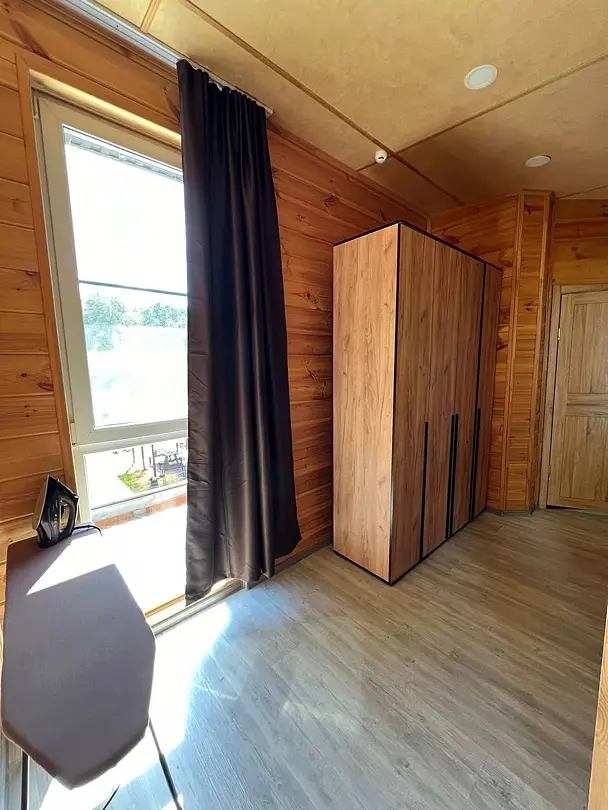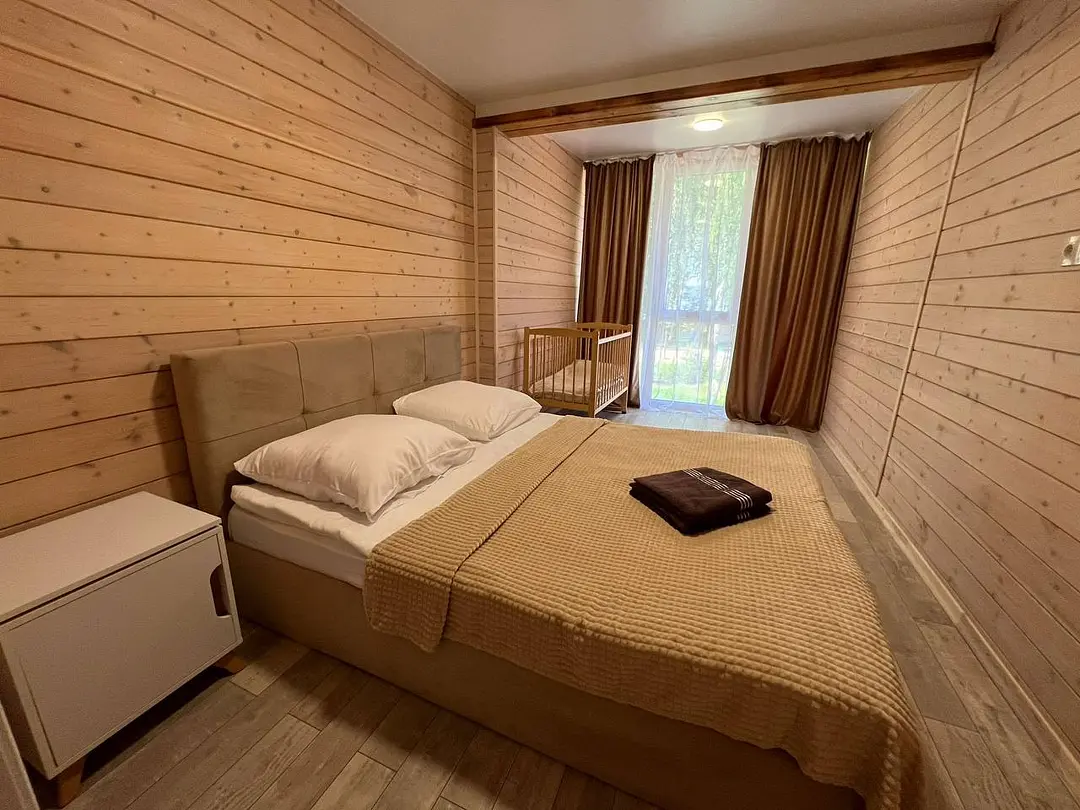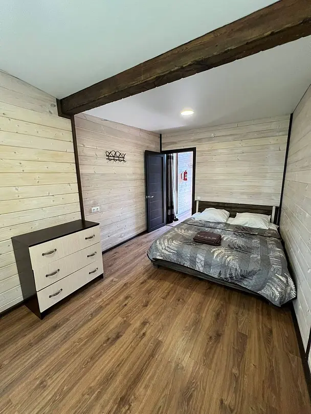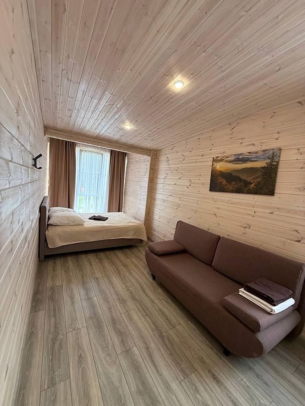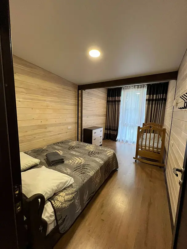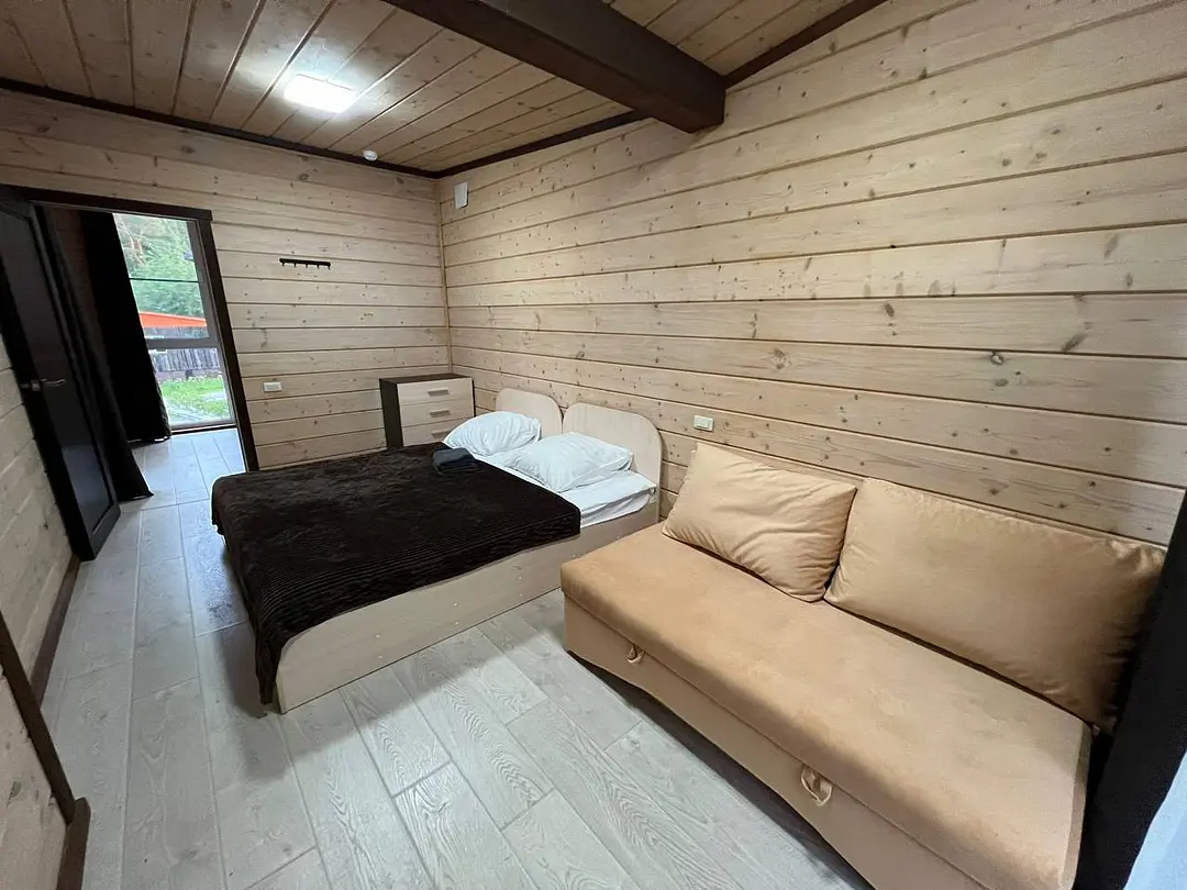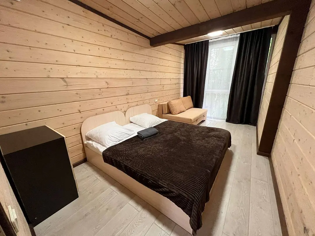 В номере: кровать и диван, ТВ, чайник, холодильник, микроволновая печь, душ, туалет, балкон, мангальная зона.