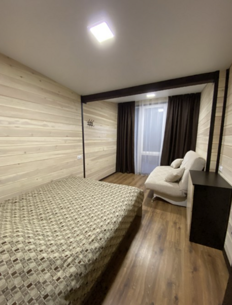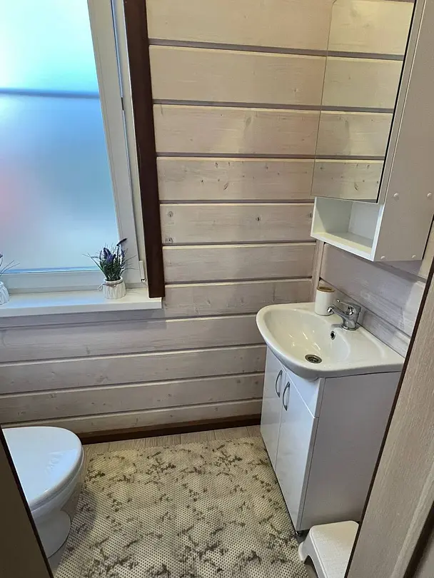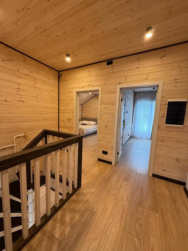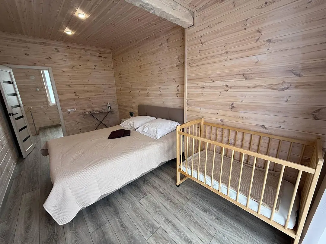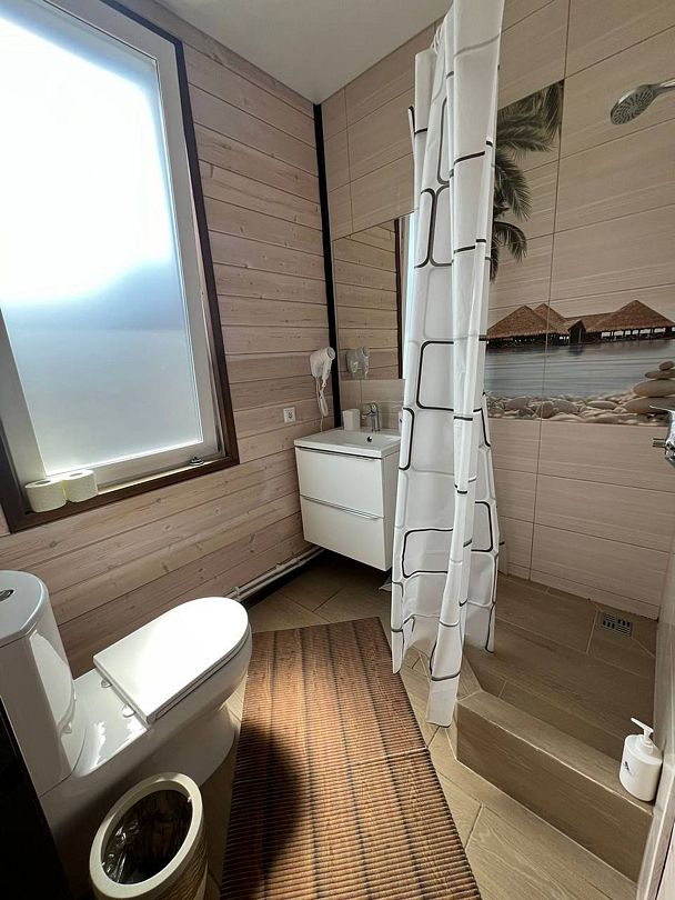 Двухэтажный дом со всеми удобствами. Первый этаж - кухня, гостинная, санузел, выход на веранду. Второй этаж - две спальни, санузел. Спальные места: в одной комнате - двуспальная кровать; в другой - кровать и диван; на первом этаже - двуспальный диван.