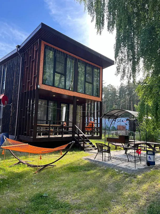 Панорамные окна; два этажа ; мангальная зона; задний двор; летняя веранда с качелей.