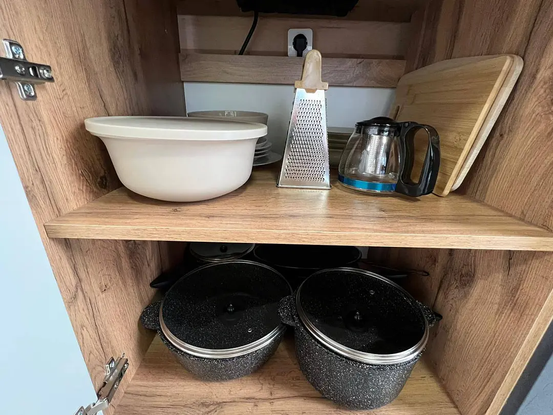 В номере есть вся необходимая посуда для приготовления и приема пищи: фен, тв, микроволновая печь, холодильник, чайник, wi-fi
