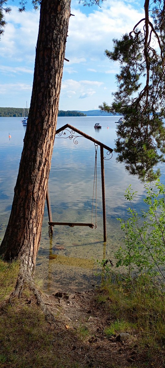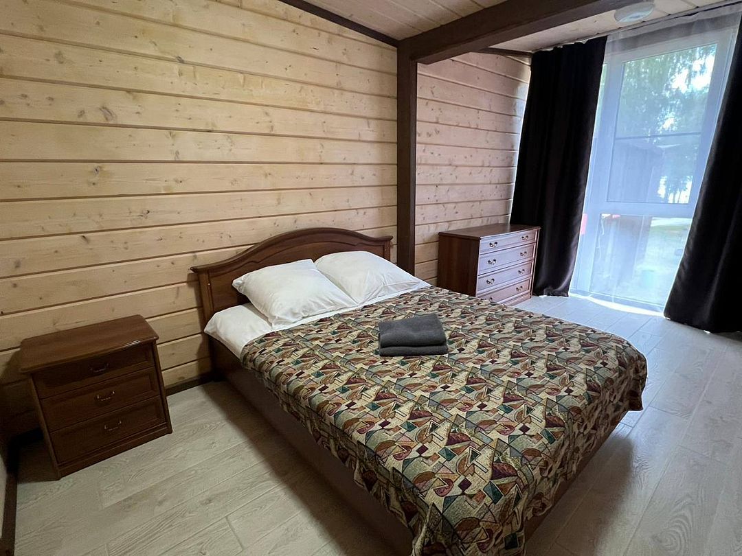 Двуспальная кровать; комод; стол; стулья; микроволновая печь; чайник; мангальная зона. Вид на озеро и близость к озеру - 80 метров.