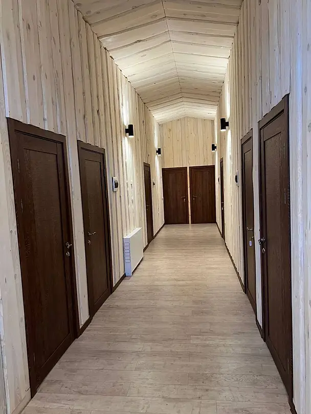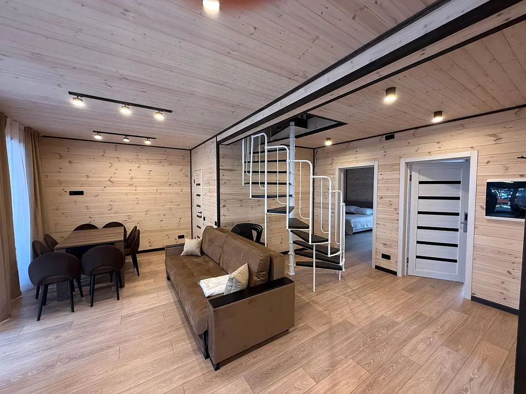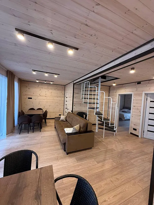 Таких домиков 4 ; расположены вдоль одной линии. Можно компанией отдохнуть- каждому по домику. Или как дополнительные места к большим шале.