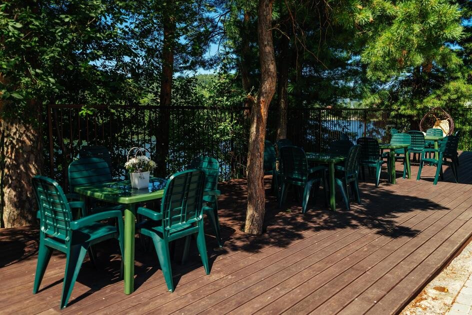 На территории базы отдыха «Рыжий кот» есть большая кухня-столовая.
