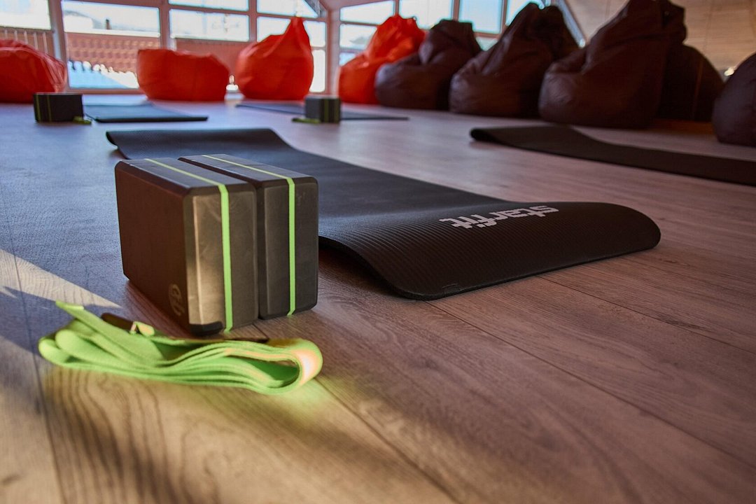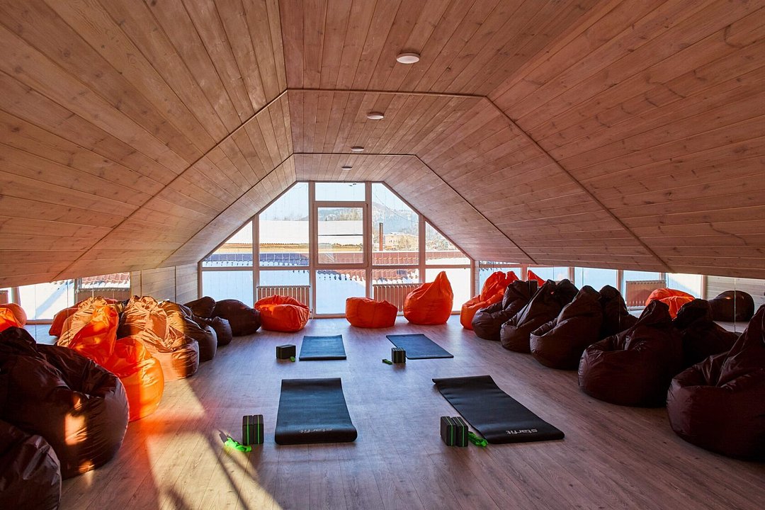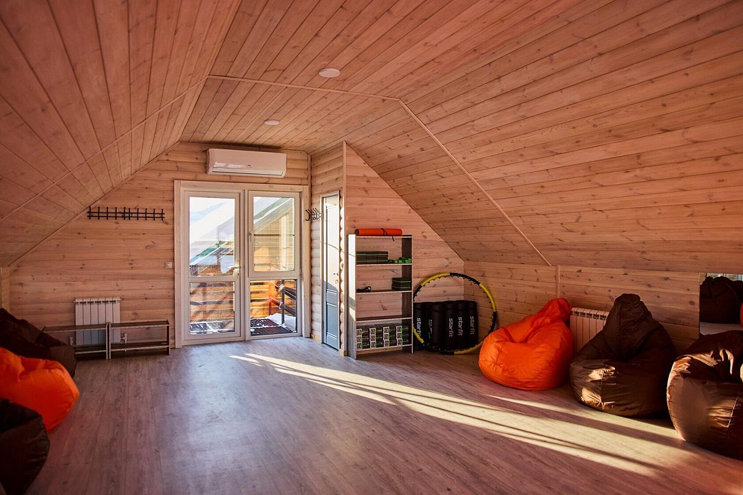 На территории базы отдыха «Рыжий кот» есть спортивный зал со снаряжением для занятий фитнесом или йогой.