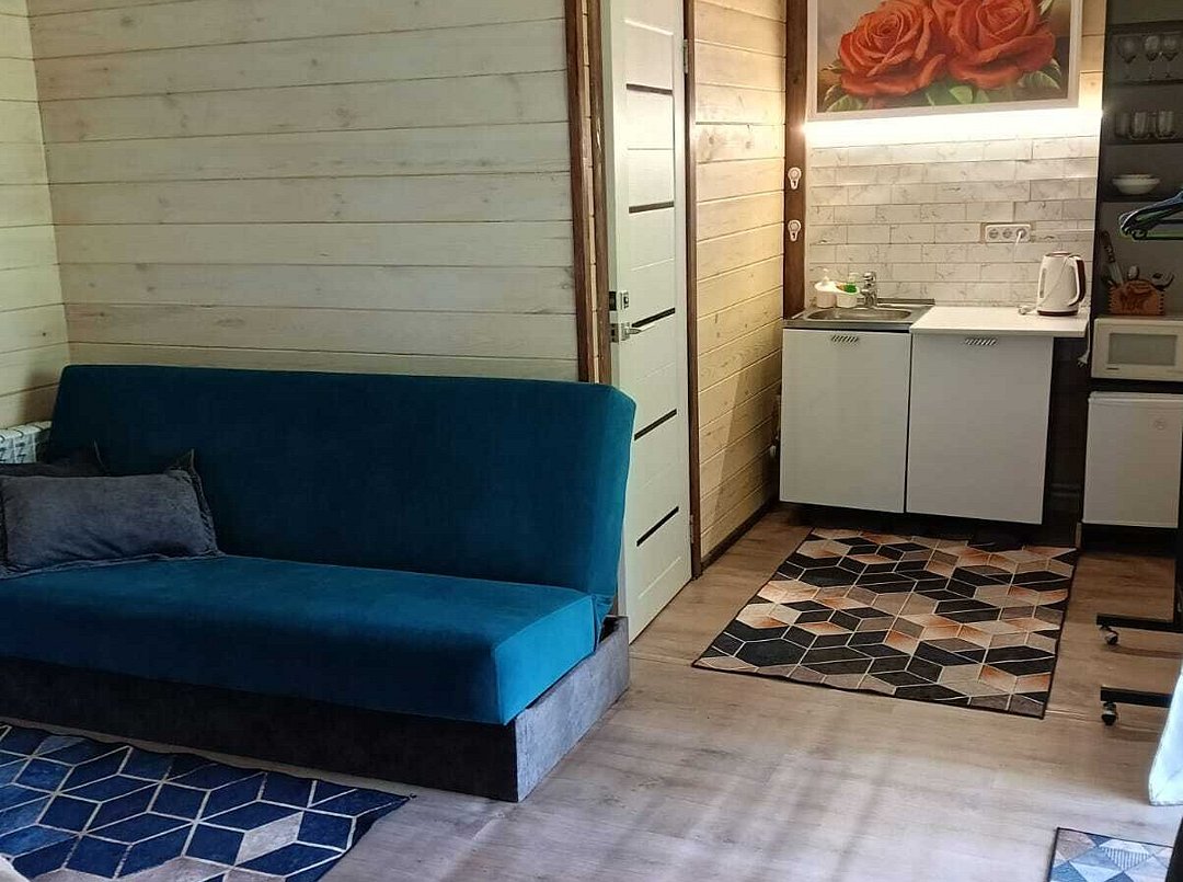 Отдельно стоящий дом, для круглогодичного проживания, со своей террасой. В доме двуспальная кровать с возможностью разделения, диван/кресло. Мини кухня: микроволновая печь, чайник, холодильник, кухонные принадлежности. Сан. узел с душевой.