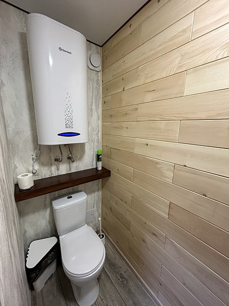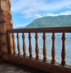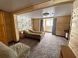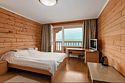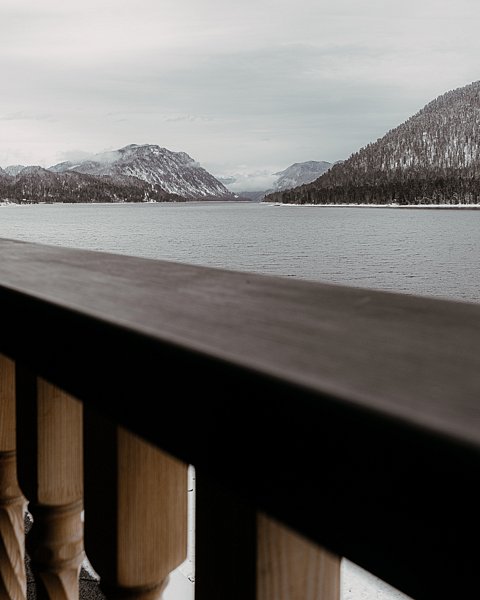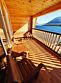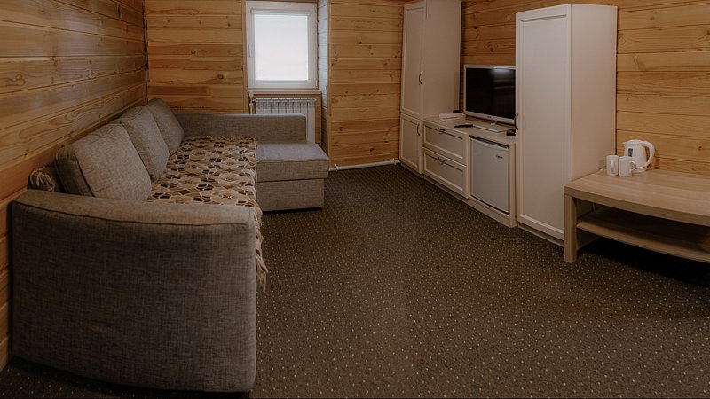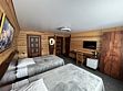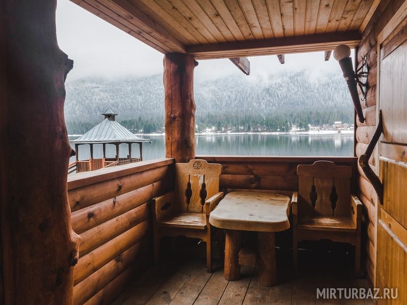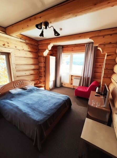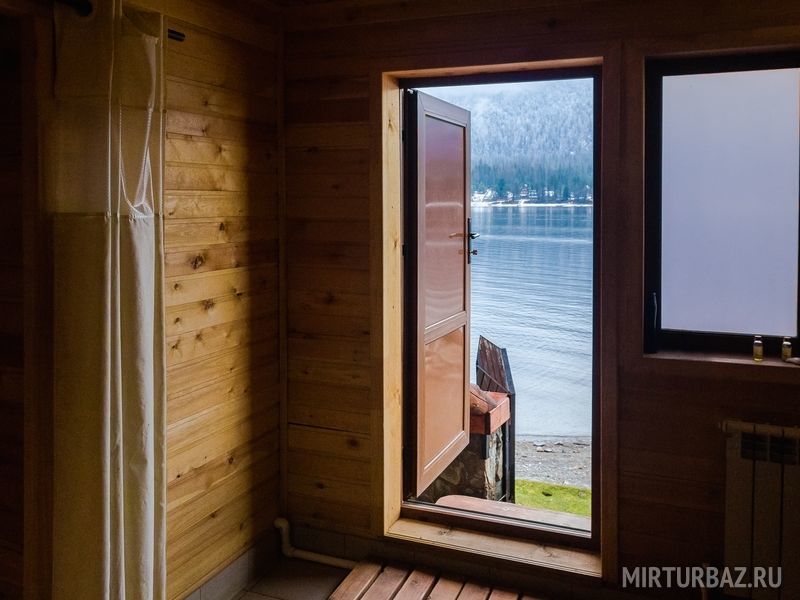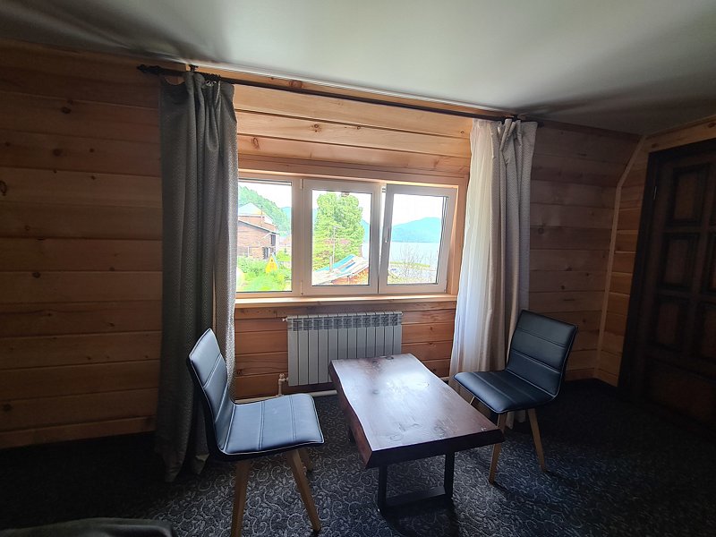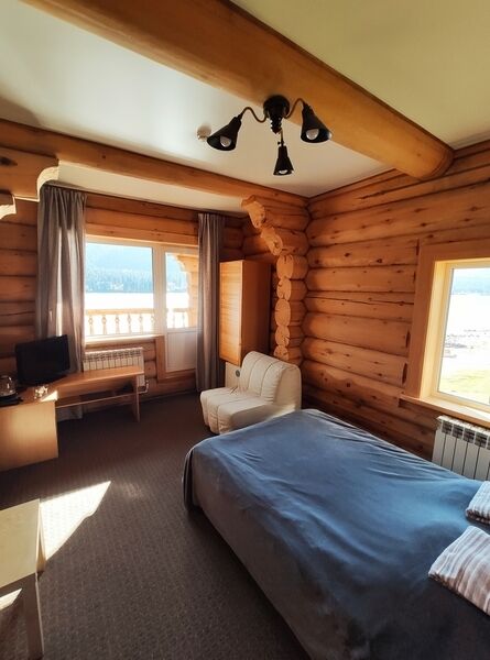 Номер студия с большим панорамным окном и лоджией с видом на озеро. Находится в отдельно стоящем корпусе, над баней.