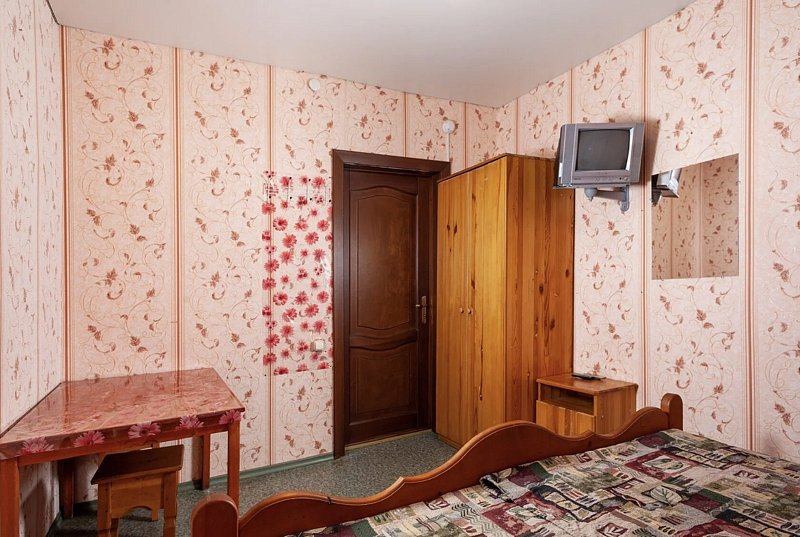 Расположен на третьем этаже гостиницы, вход с торца здания. Удобства на этаже – туалет, раковина, холодильники общего пользования. Душ на первом этаже гостиницы.
