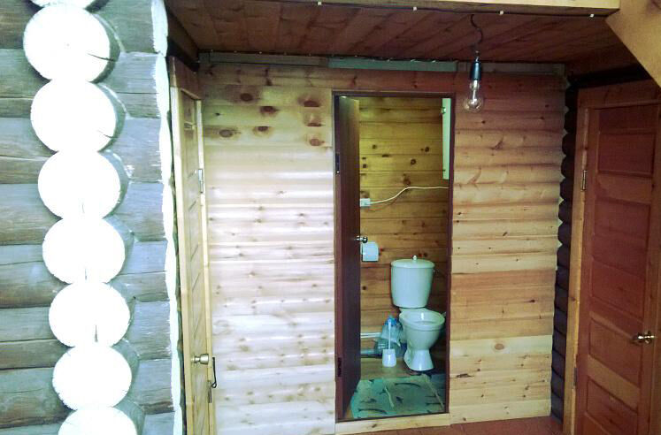 Дом №2. В одном из номеров два раскладных дивана и телевизор, во втором номере — диван и кухонная зона с холодильником, эл. плитой и посудой. Выход на балкон с видом на озеро. Отопление печное. Для этих номеров — общий санузел с WC и душем на этаже. Домик сдается целиком.