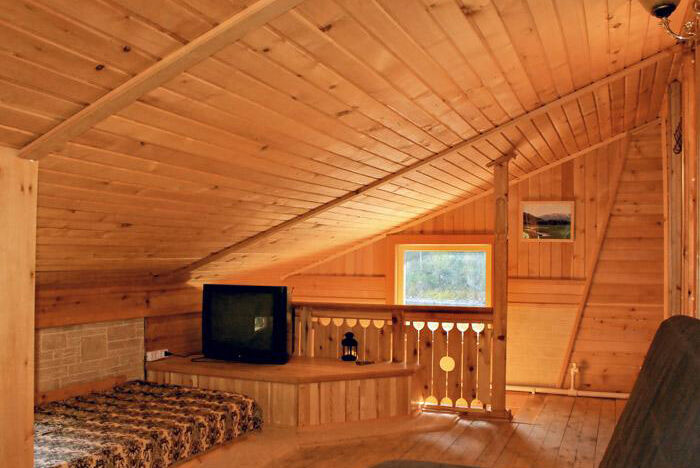 Второй этаж — большой, трехкомнатный номер с панорамным окном, площадью 46 м.кв. Возможно размещение до 7 человек. Спальня, холл, столовая, санузел с душем. В номерах телевизоры, холодильники, СВЧ-печи и вся необходимая посуда.