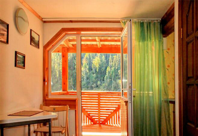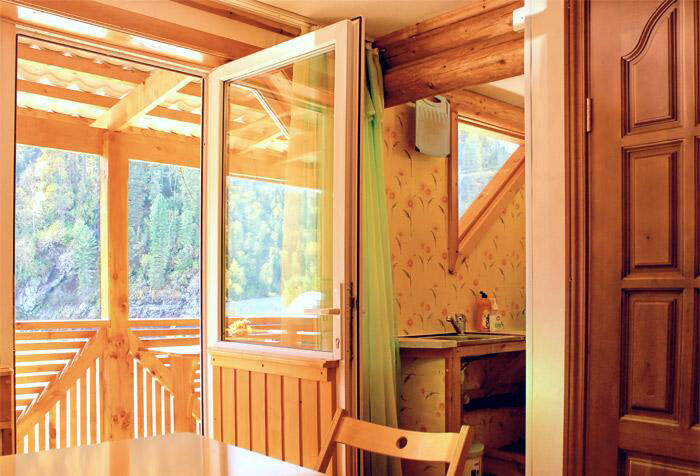 На первом этаже трехместный номер площадью 25 м.кв. Спальня, столовая, санузел с душем и терраса с видом на реку Бия.