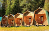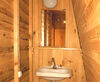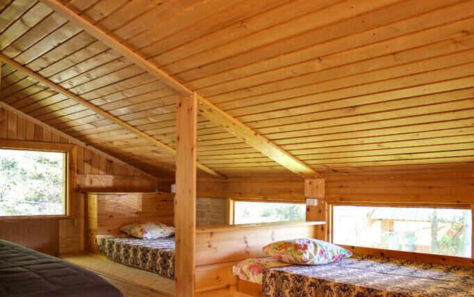 Двухместные летние домики-бунгало имеют просторное спальное отделение и небольшое отделение с биотуалетом и раковиной с холодной водой.
