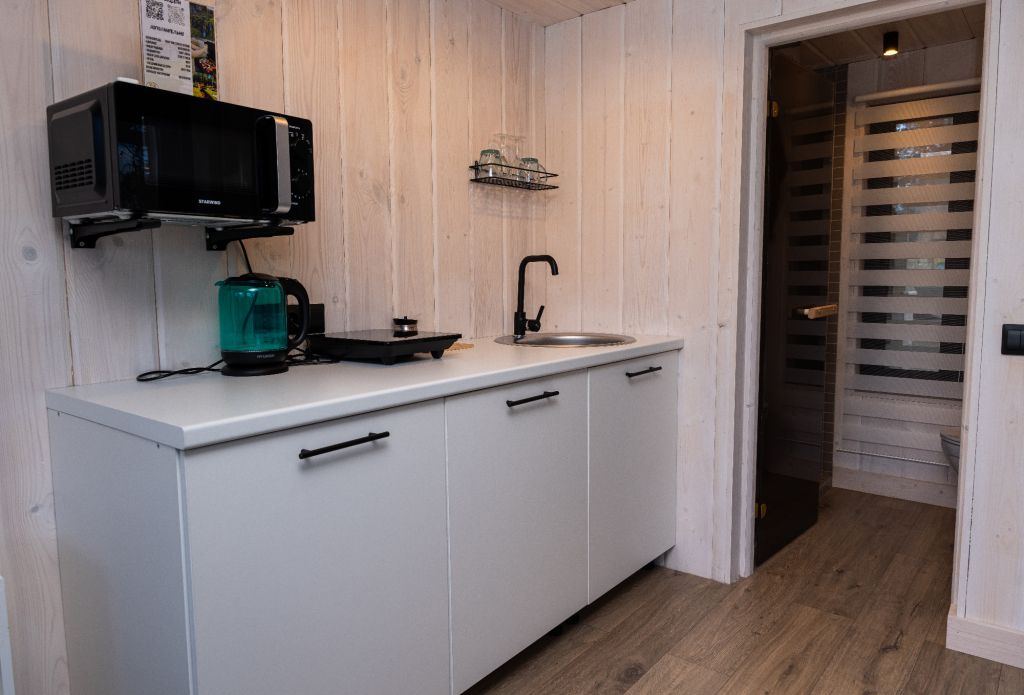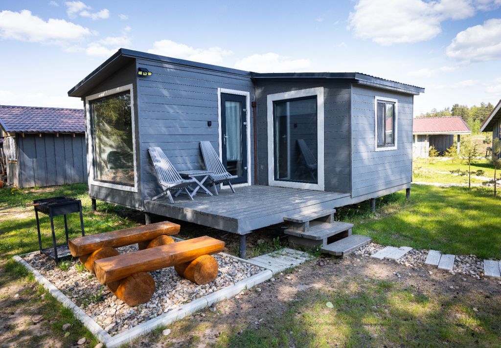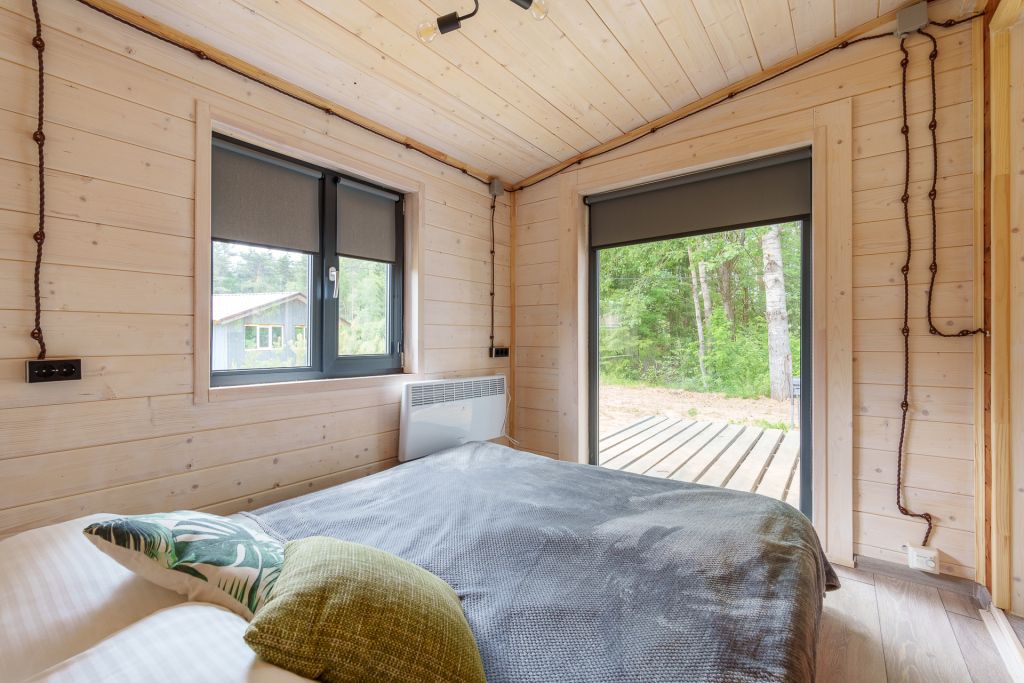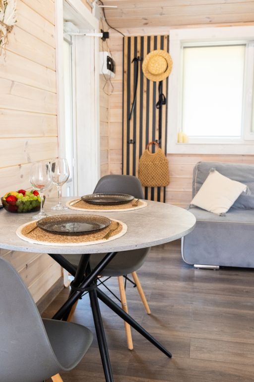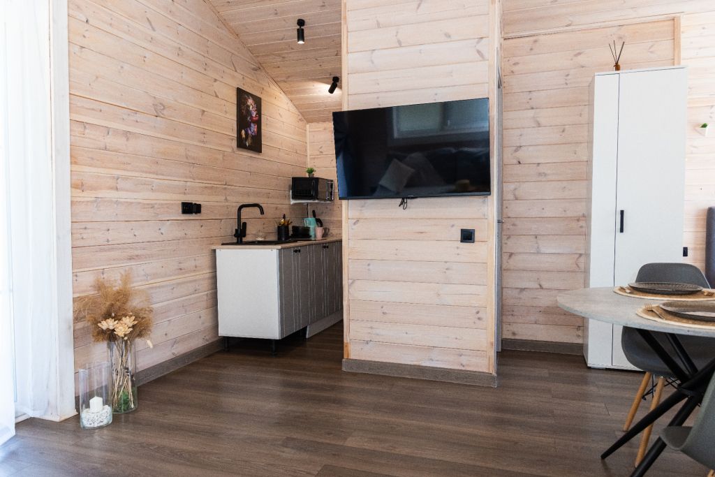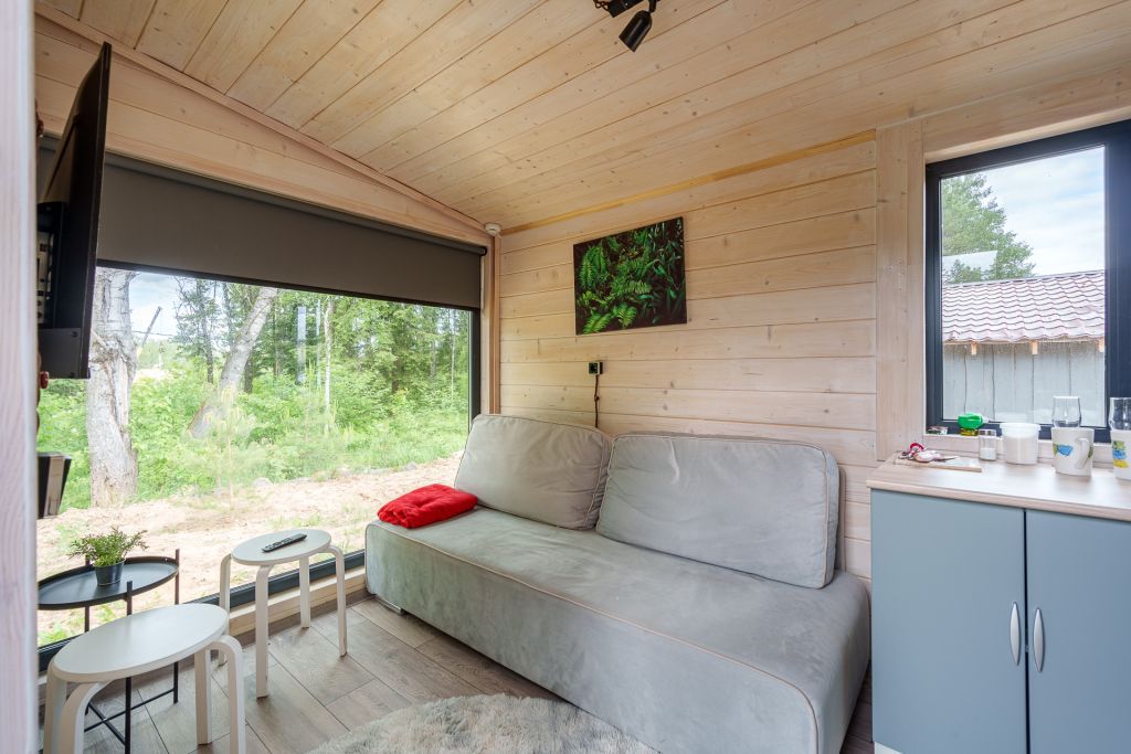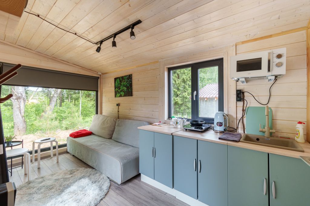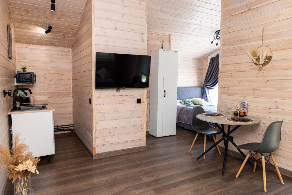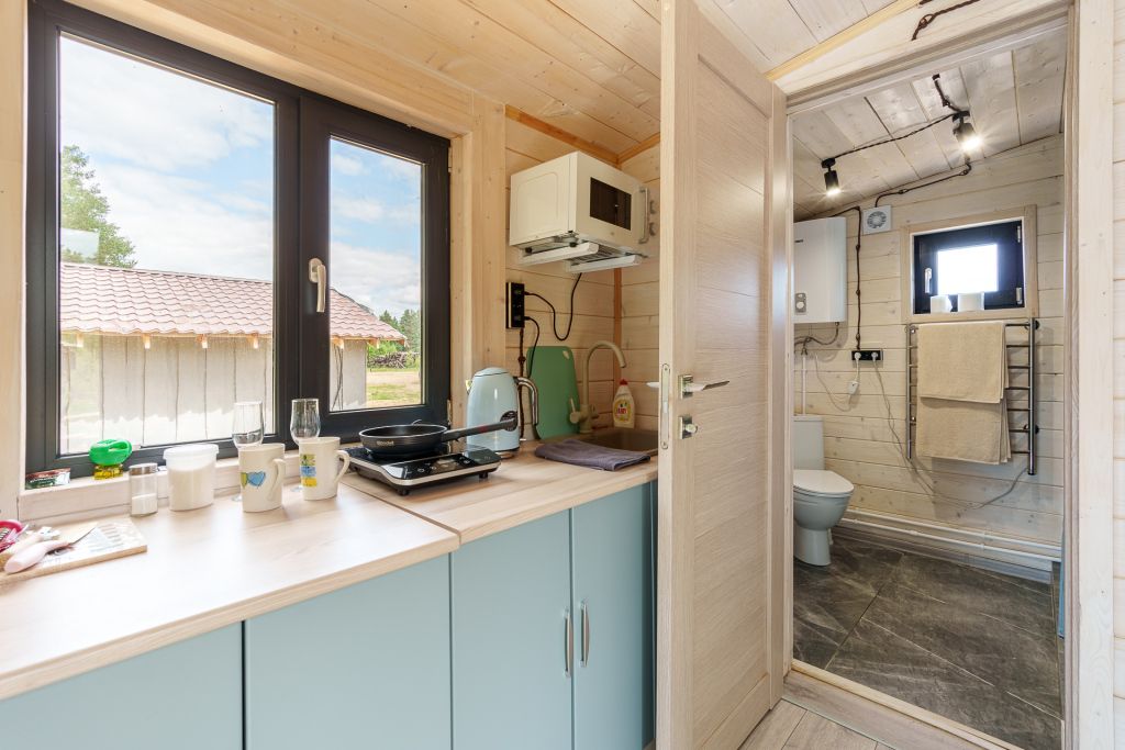 Внутри есть все необходимое для комфортного отдыха: кухня-гостиная, ванная комната, и спальня в светлых тонах.
