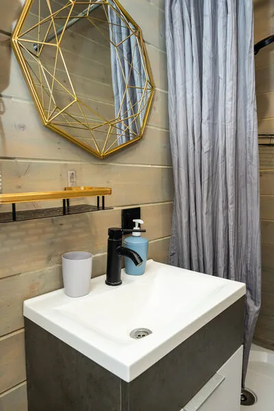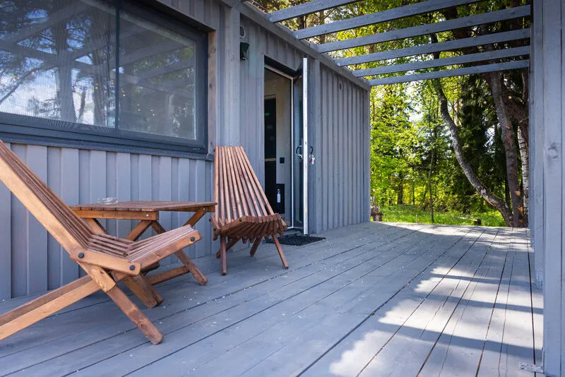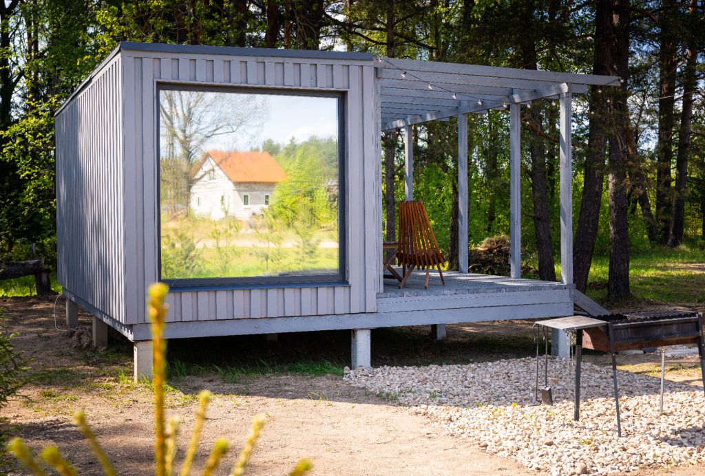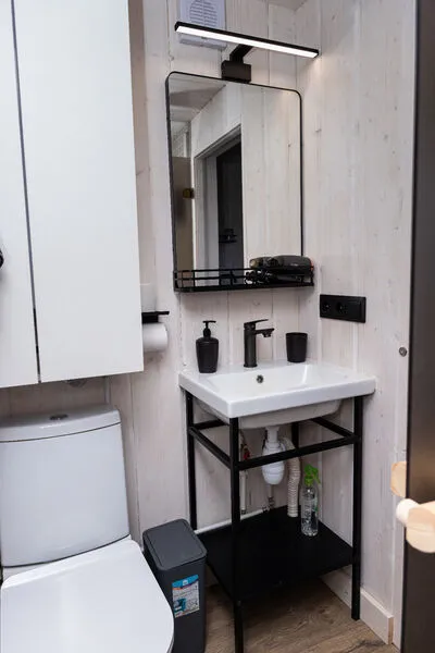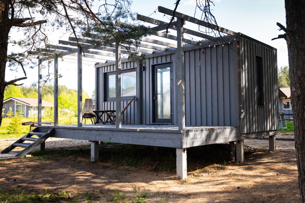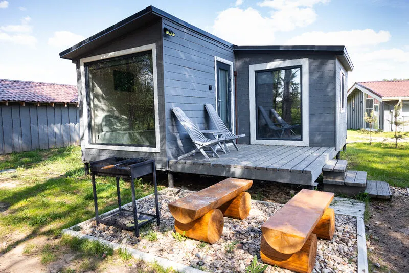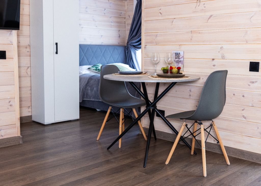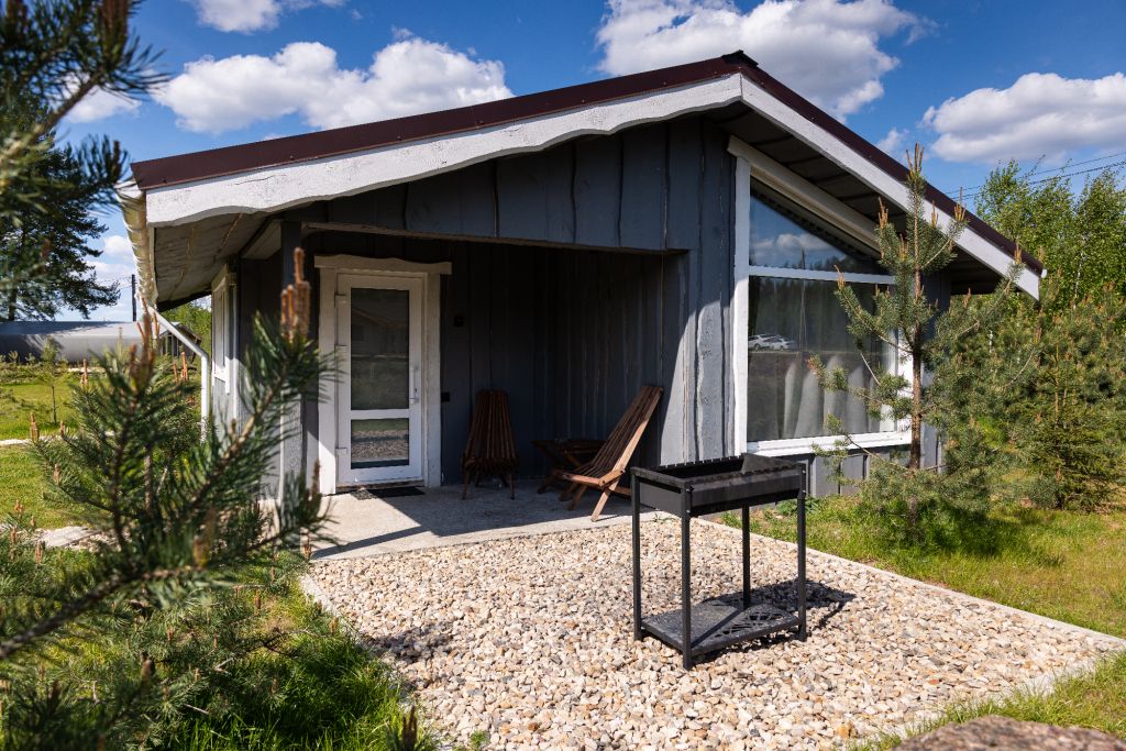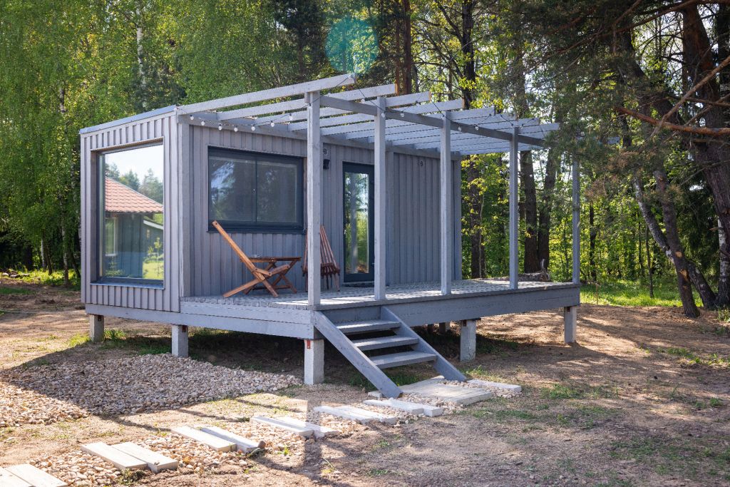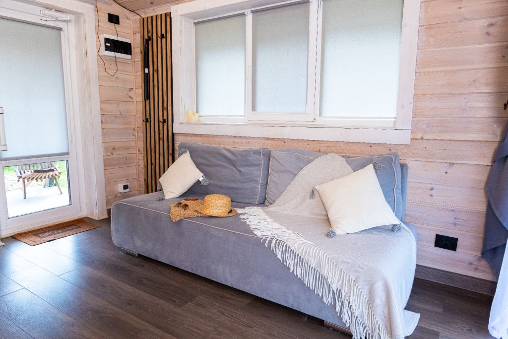 Внутри есть все необходимое для комфортного отдыха: кухня-гостиная, ванная комната, и спальня в светлых тонах.