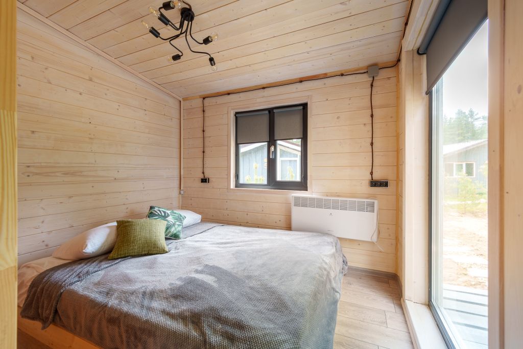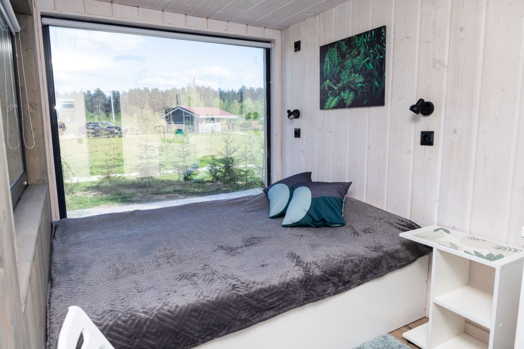 Улучшенный модульный домик с большой двуспальной кроватью и панорамным окном.
