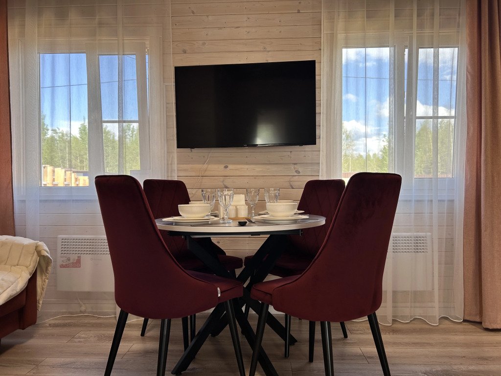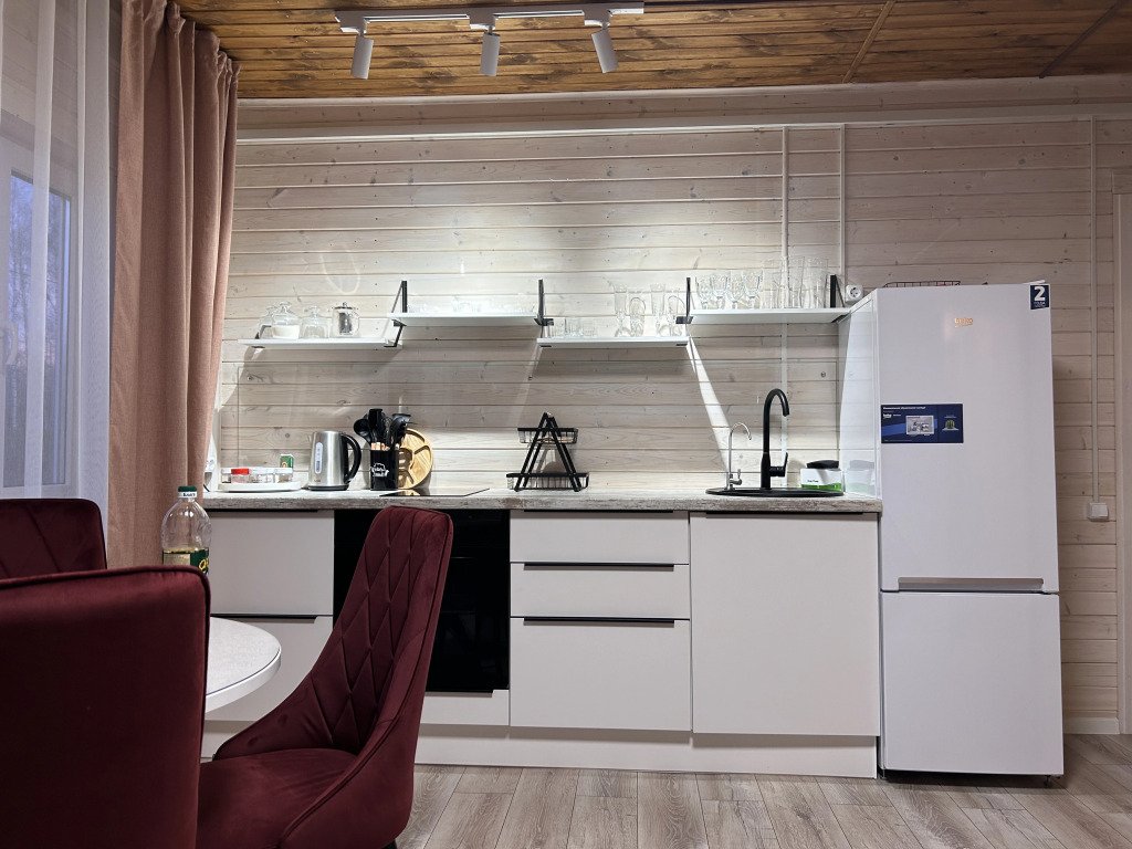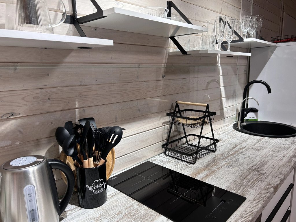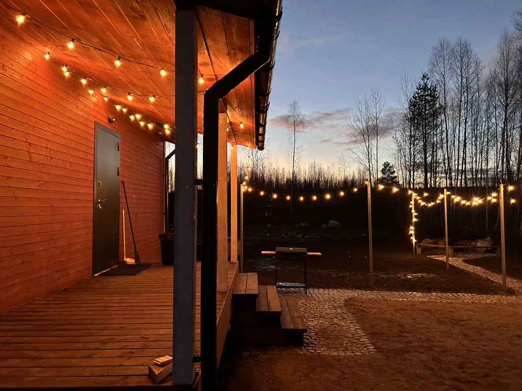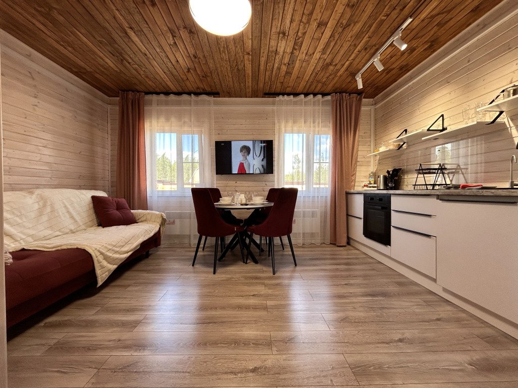 Дом рассчитан для комфортного прибывая от 2-х до 6-ти человек. Две спальни с двуспальными кроватями и большой раскладной диван. В доме есть небольшая сауна с дровяной печью, ее эксплуатация входит в стоимость аренды. Гостям доступны: набор посуды для каждого отдыхающего, индукционная варочная поверхность, духовой шкаф, электрочайник, холодильник с морозильной камерой; чай и кофе; питьевая вода из фильтра; фен, стиральная машина.