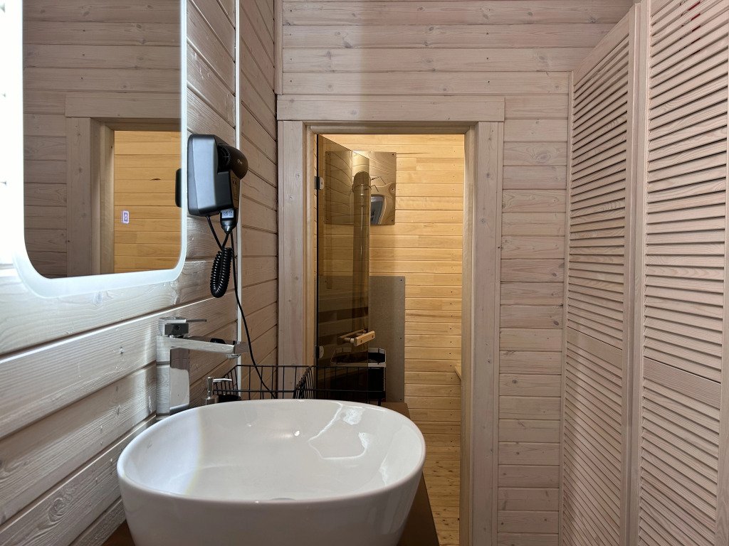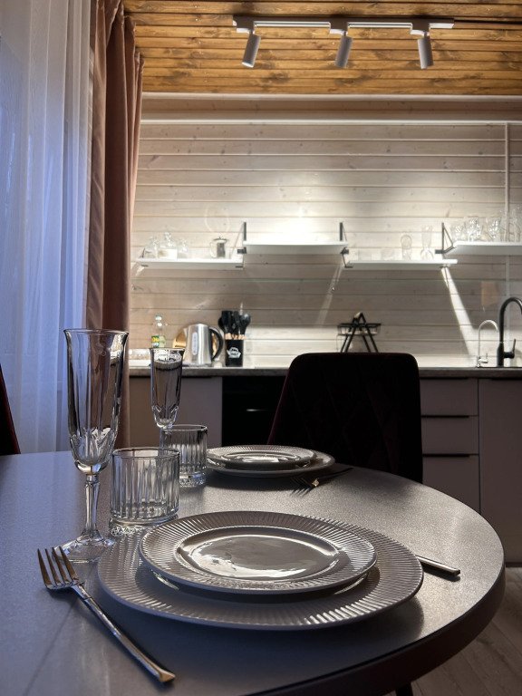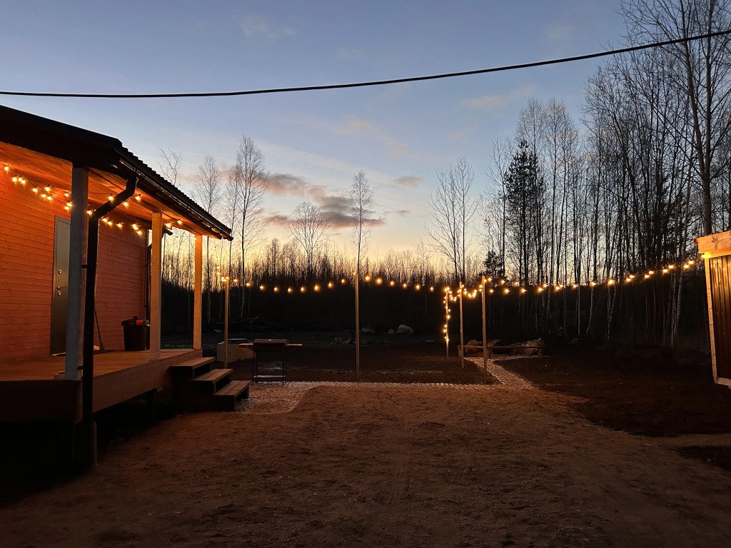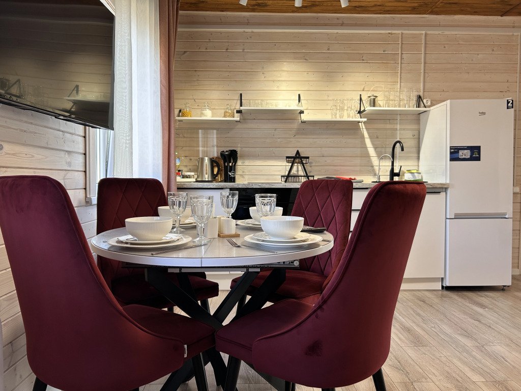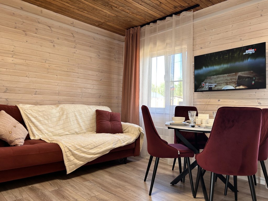 Дом рассчитан для комфортного прибывая от 2-х до 6-ти человек. Две спальни с двуспальными кроватями и большой раскладной диван. В доме есть небольшая сауна с дровяной печью, ее эксплуатация входит в стоимость аренды. Гостям доступны: набор посуды для каждого отдыхающего, индукционная варочная поверхность, духовой шкаф, электрочайник, холодильник с морозильной камерой; чай и кофе; питьевая вода из фильтра; фен, стиральная машина.