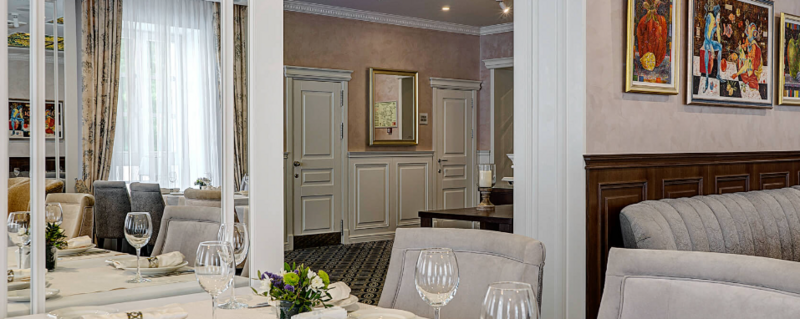 Зона с возможностью проведения приветственного коктейля. Стены декорированный репродукциями и оригинальными работами известного художника Лизунова. Хрустальные люстры и мебель выполнены на заказ по специальному дизайн-проекту.