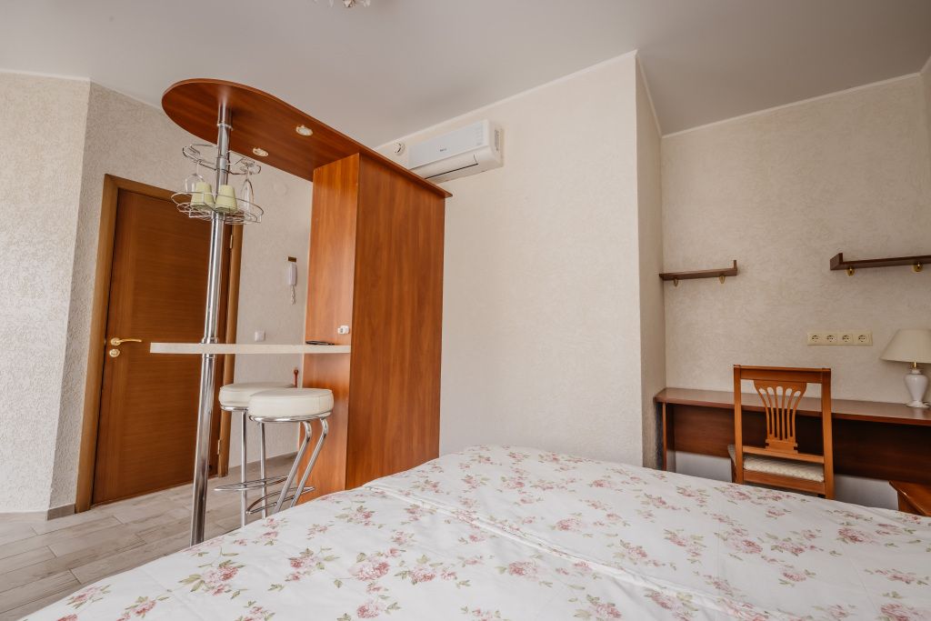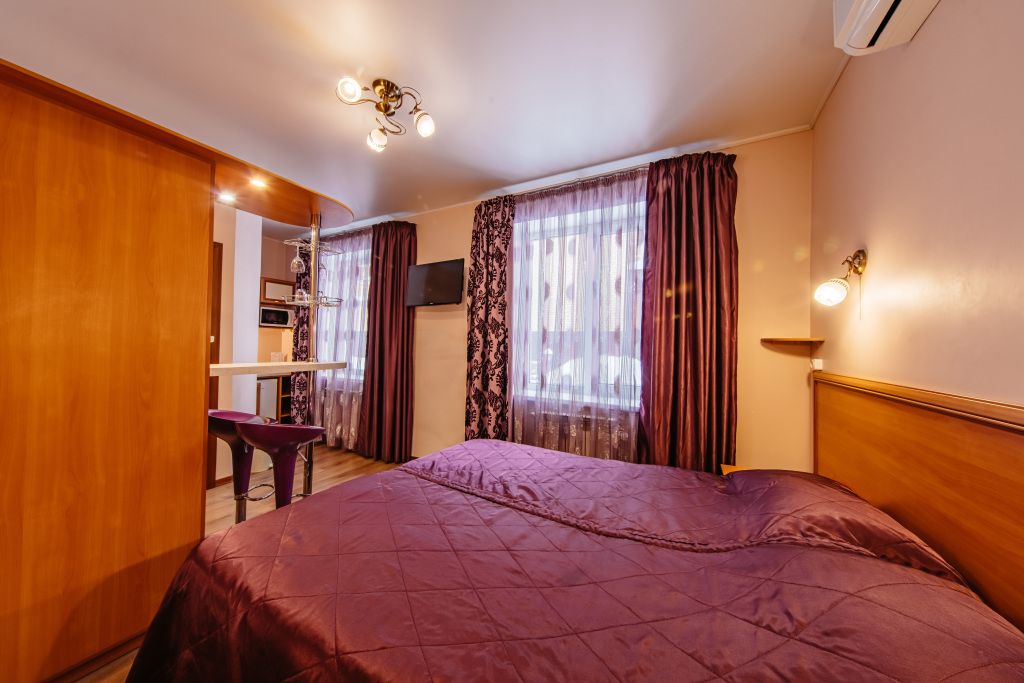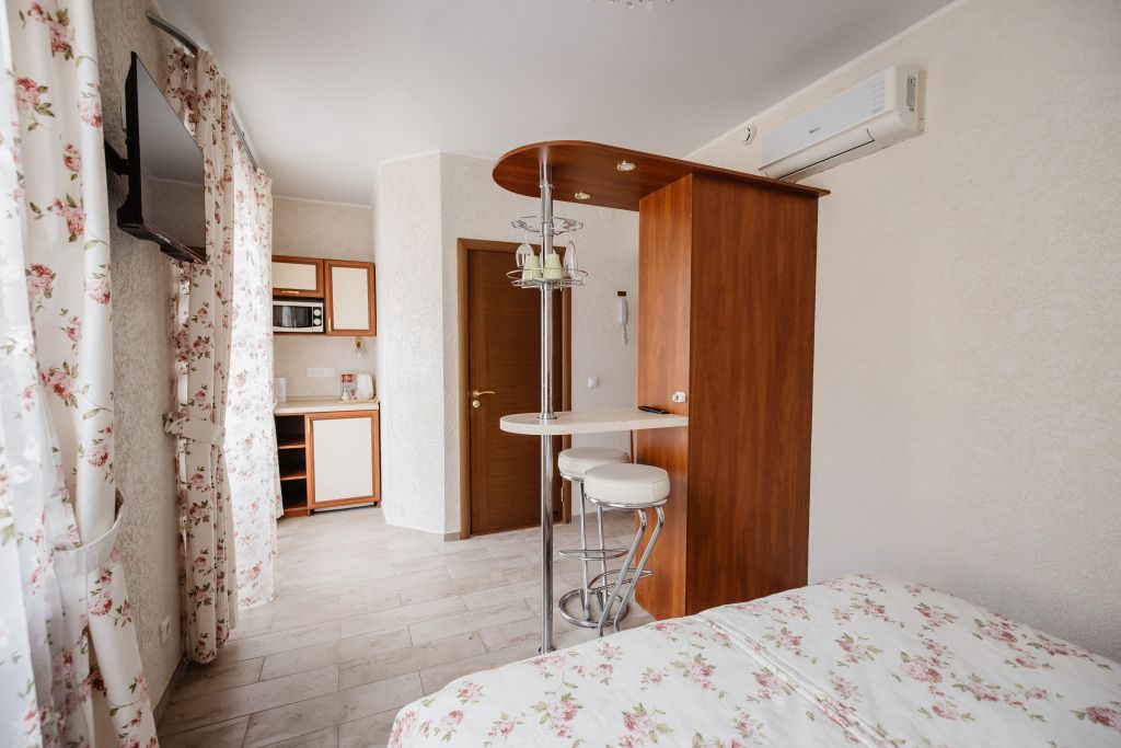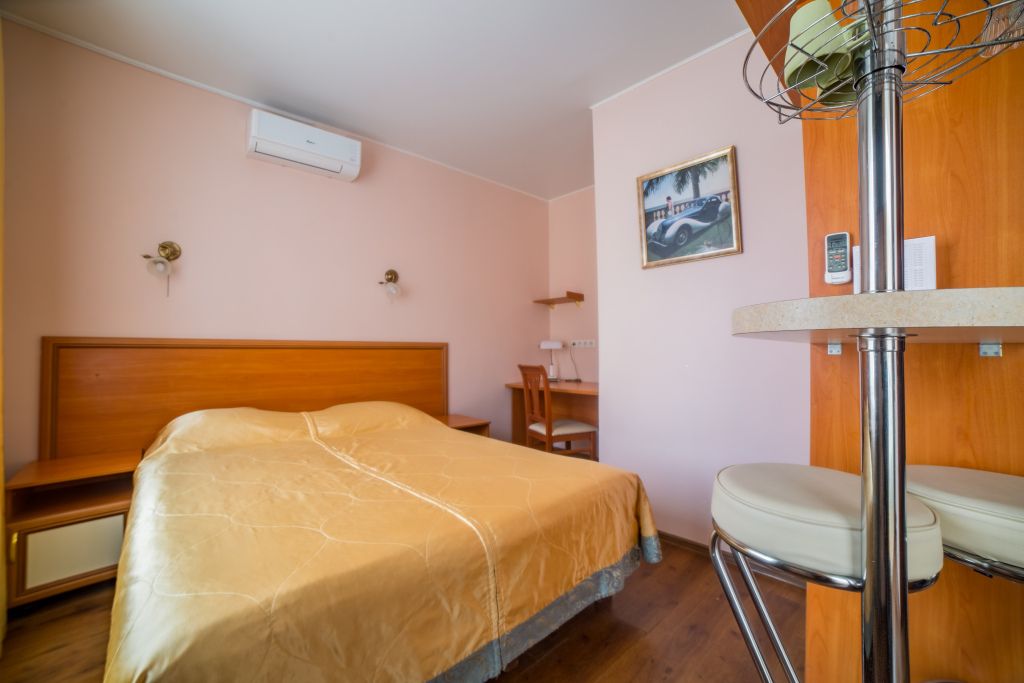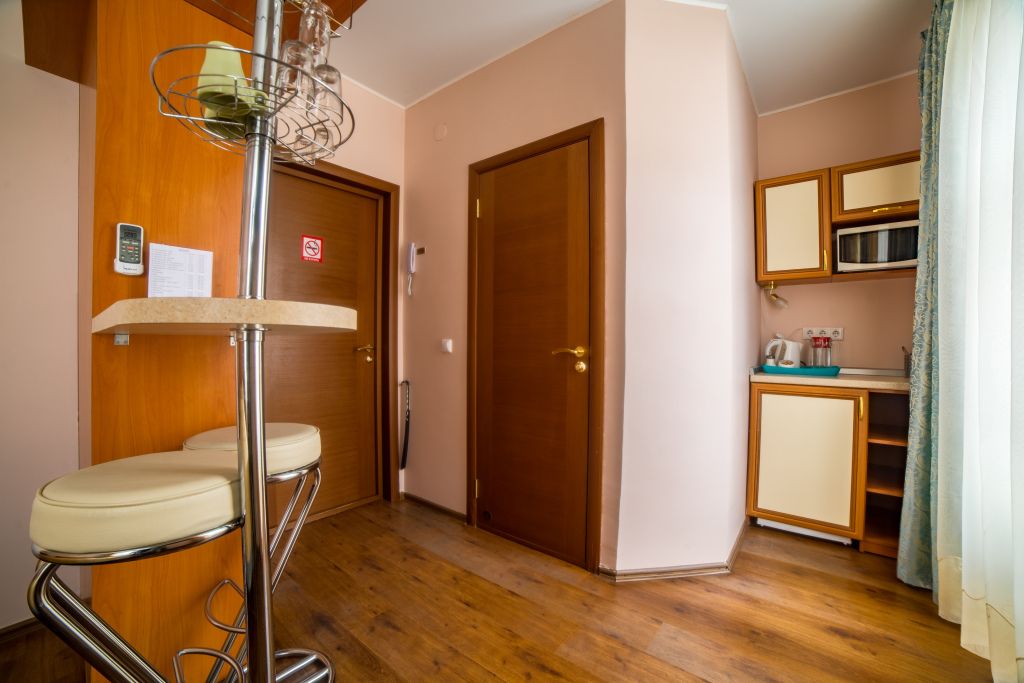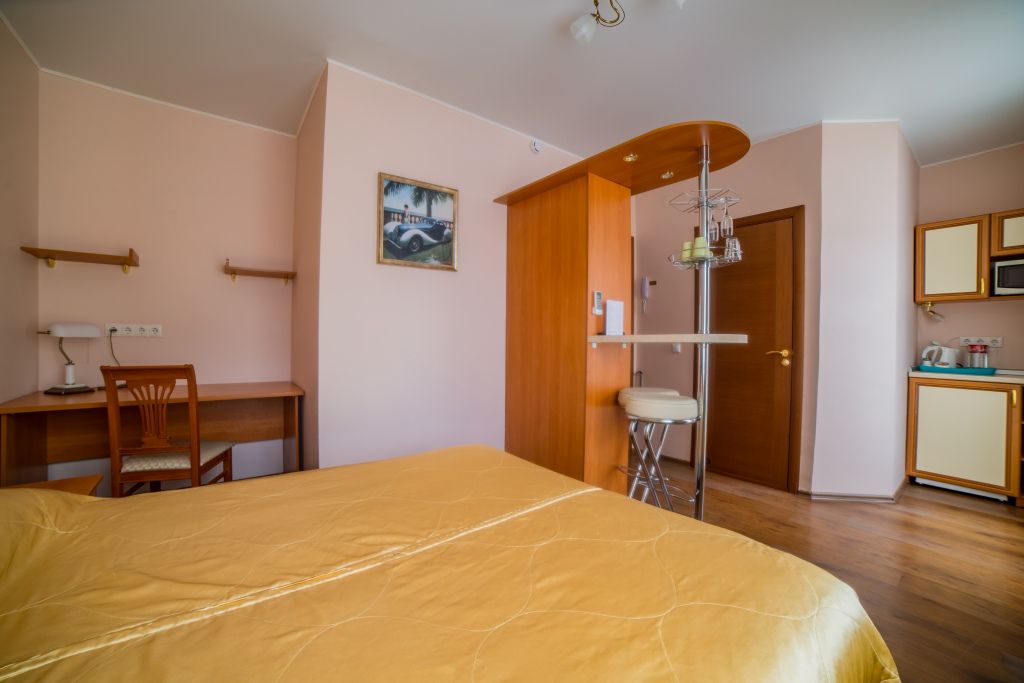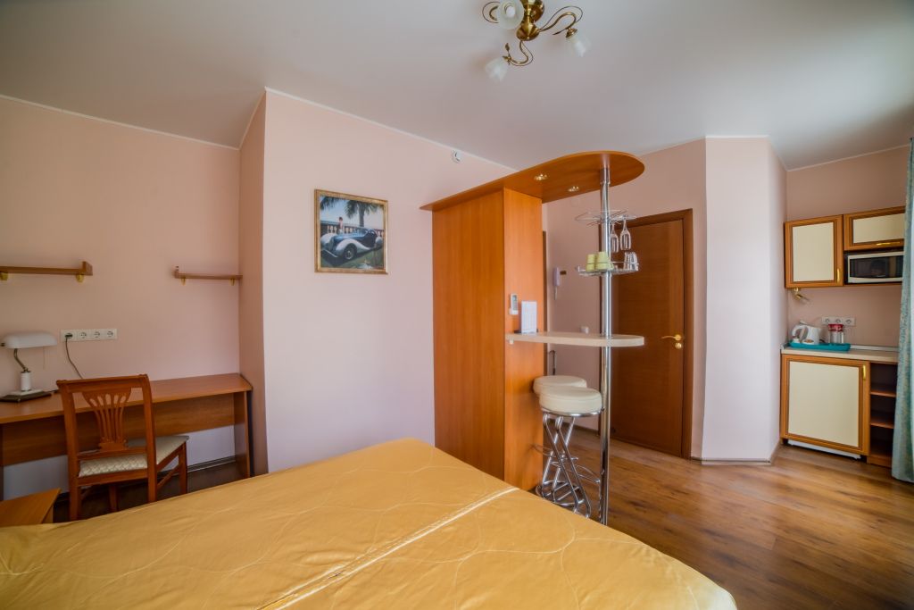 Предусматривает двухместное проживание, оборудована отдельным санузлом и душевой кабиной. В комнате: кухонный уголок (холодильник с мини-баром, СВЧ, электрический чайник, посуда); двуспальная кровать или две отдельные кровати (по желанию гостя); барная стойка (с фужерами и бокалами); две прикроватные тумбы; плазменный телевизор; стулья барные 2 шт.; шкаф для одежды; кондиционер; халат (аренда) 150 руб. Санузел: Душевая кабина; раковина; унитаз; фен; банные принадлежности (гель для душа, шампунь, жидкое мыло для рук, зубные наборы). Дополнительно: питание: завтрак (120 руб.-360 руб.), обед и ужин (по меню в любое удобное время); дополнительное место - 600 руб.В гостиничном номере