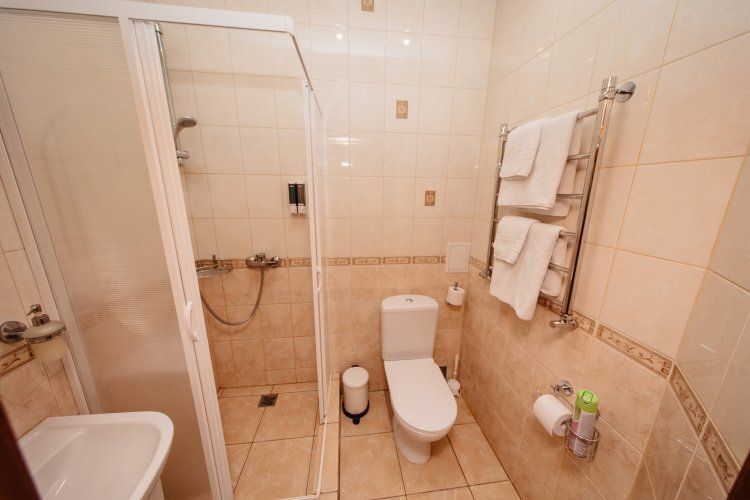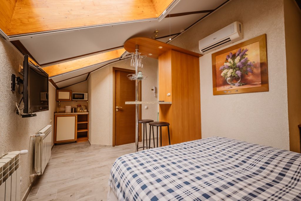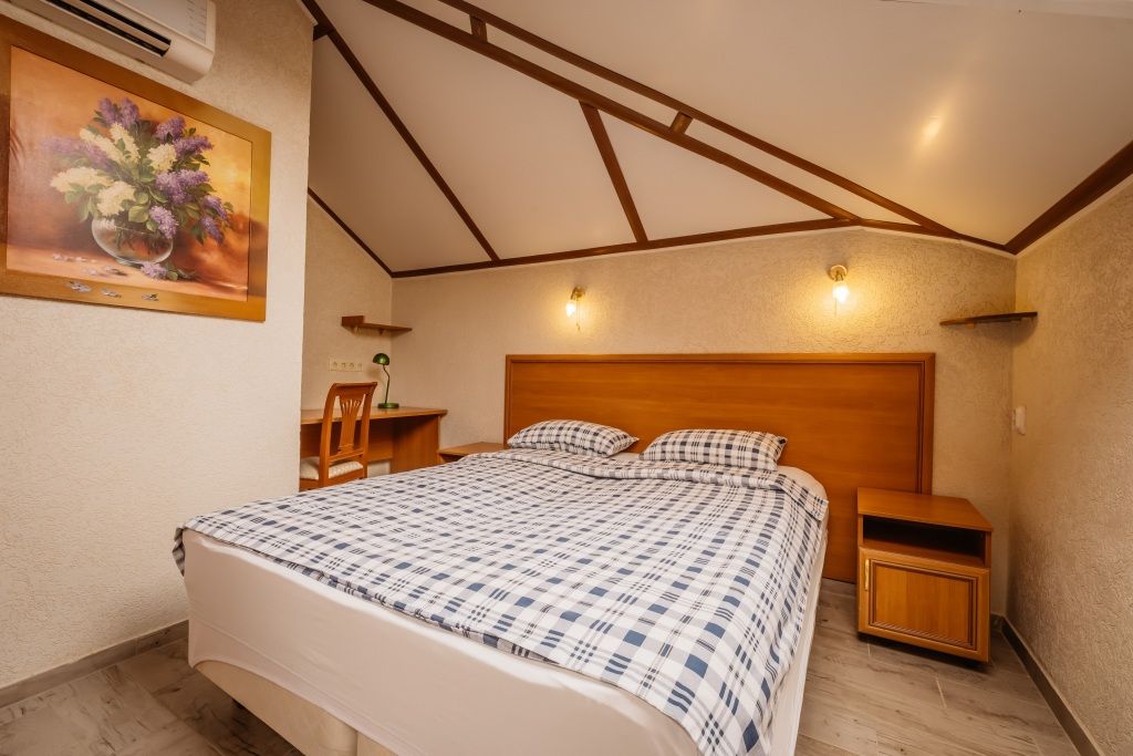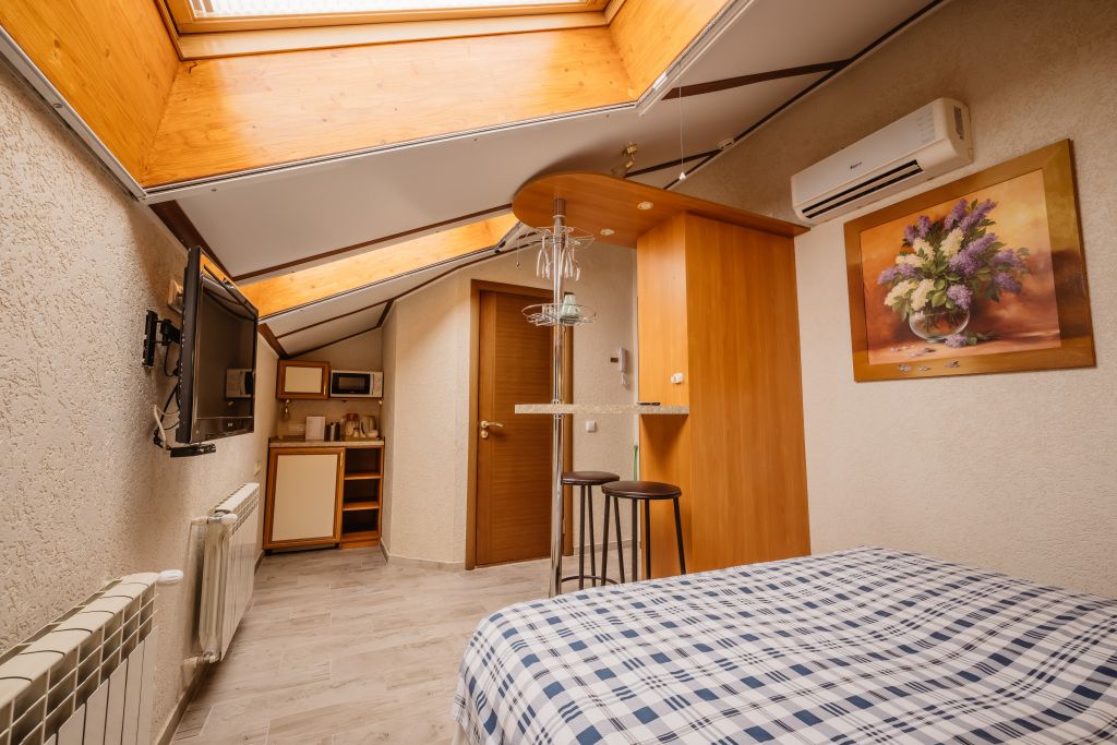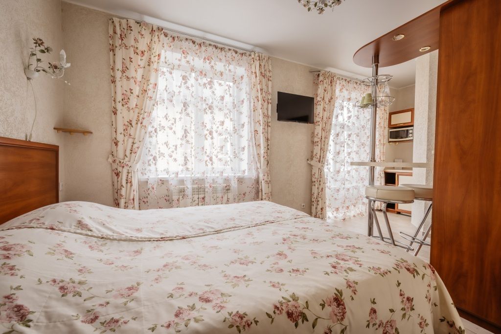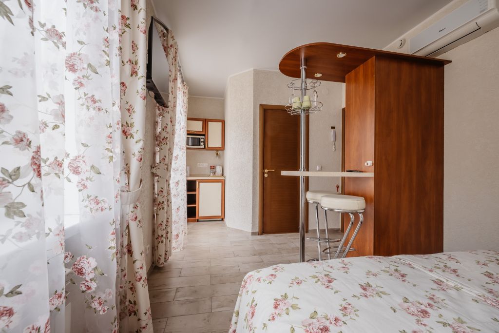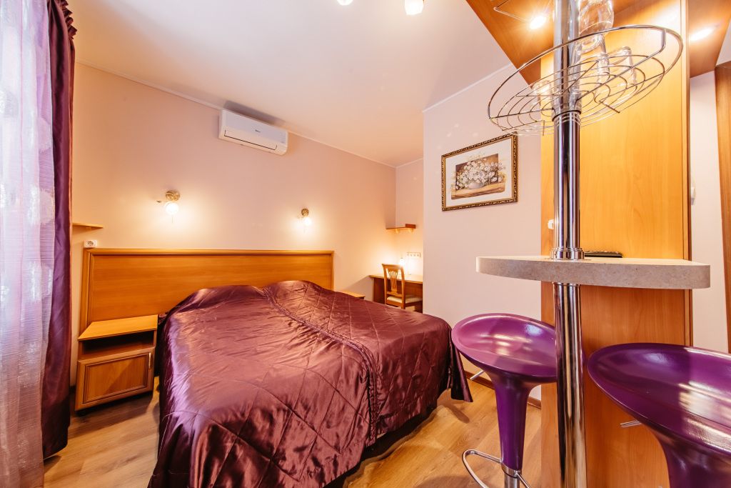 Предусматривает двухместное проживание, оборудована отдельным санузлом и душевой кабиной. В комнате: кухонный уголок (холодильник с мини-баром, СВЧ, электрический чайник, посуда); двуспальная кровать или две отдельные кровати (по желанию гостя); барная стойка (с фужерами и бокалами); две прикроватные тумбы; плазменный телевизор; стулья барные 2 шт.; шкаф для одежды; кондиционер; халат (аренда) 150 руб. Санузел: Душевая кабина; раковина; унитаз; фен; банные принадлежности (гель для душа, шампунь, жидкое мыло для рук, зубные наборы). Дополнительно: питание: завтрак (120 руб.-360 руб.), обед и ужин (по меню в любое удобное время); дополнительное место - 600 руб.В гостиничном номере