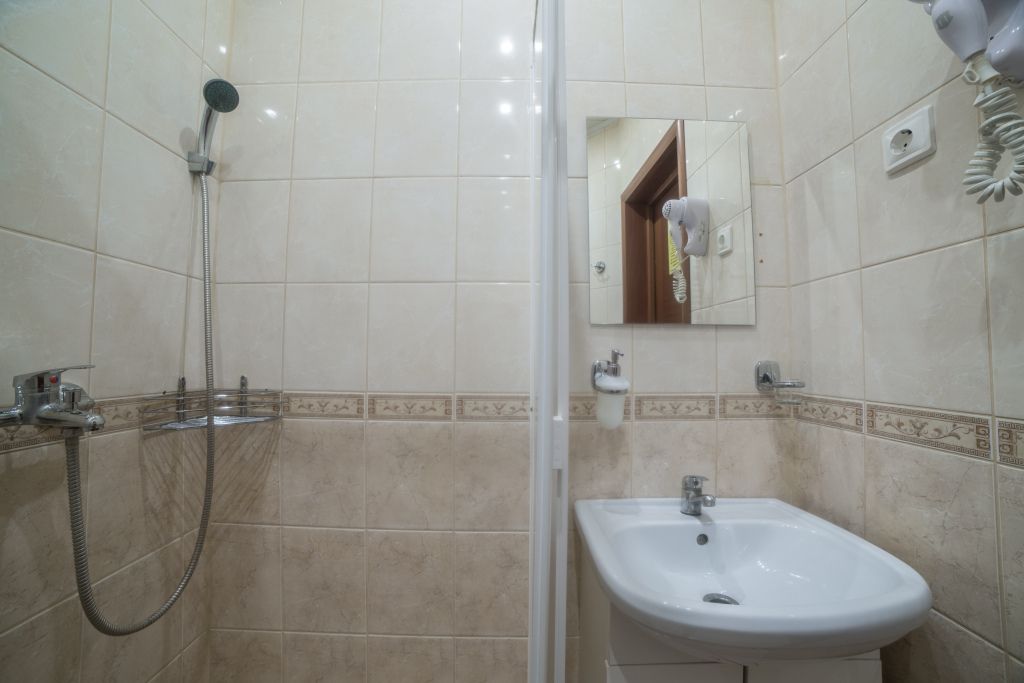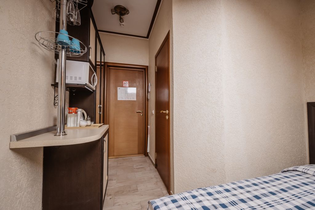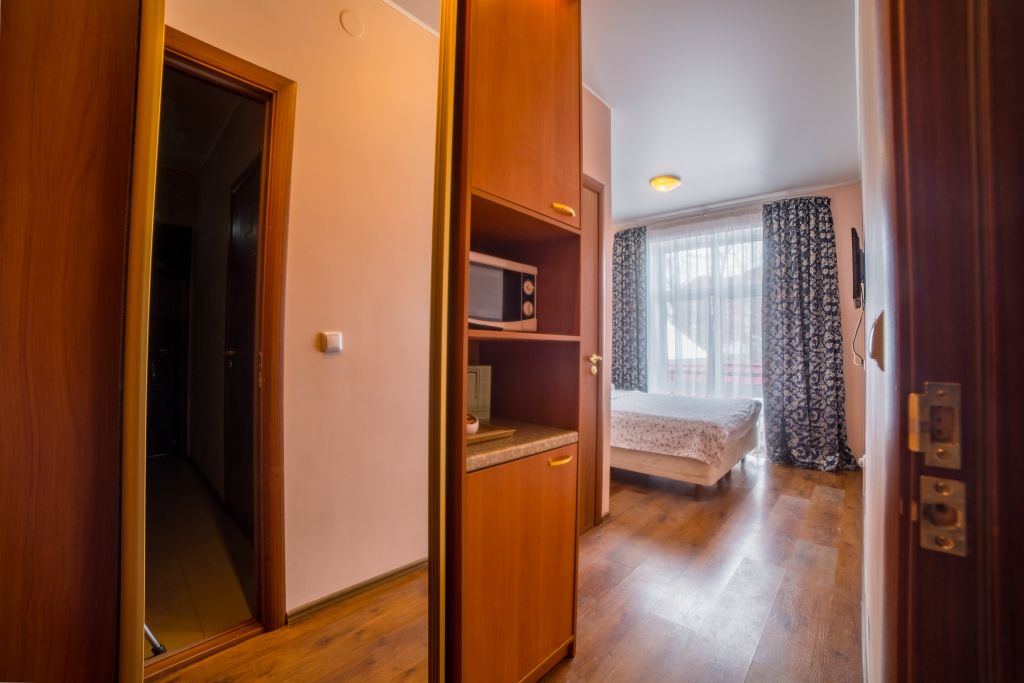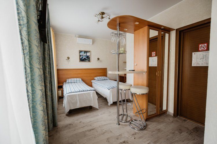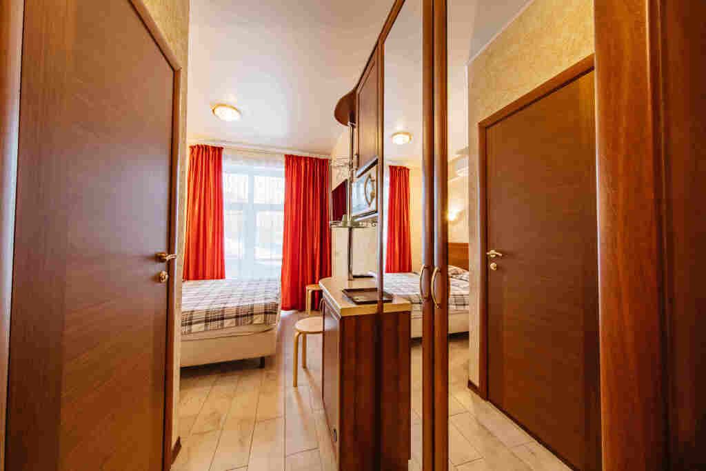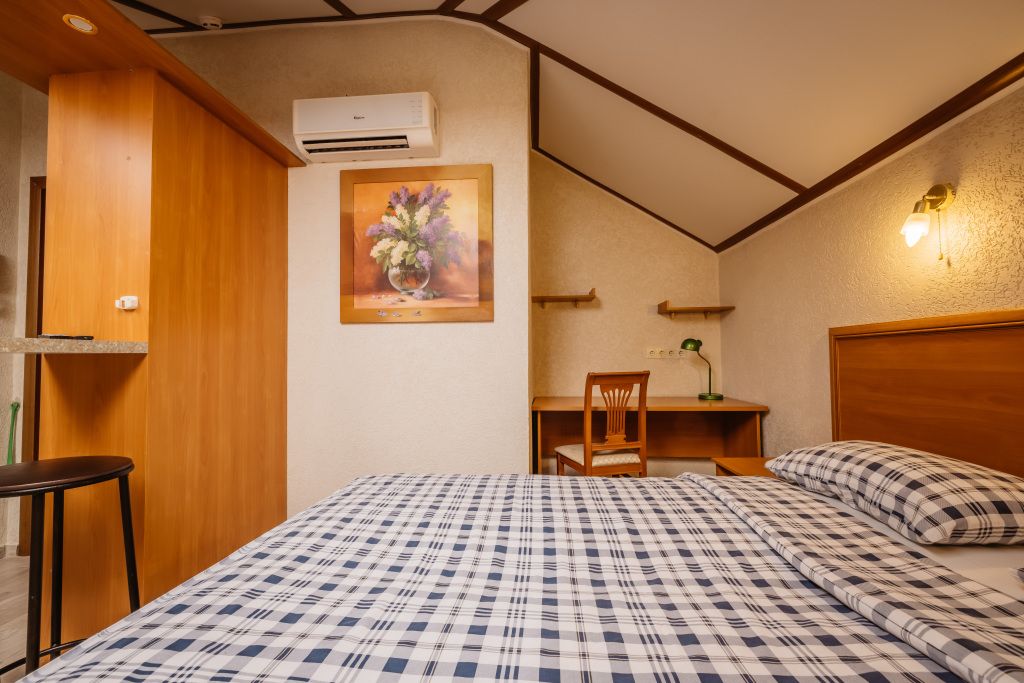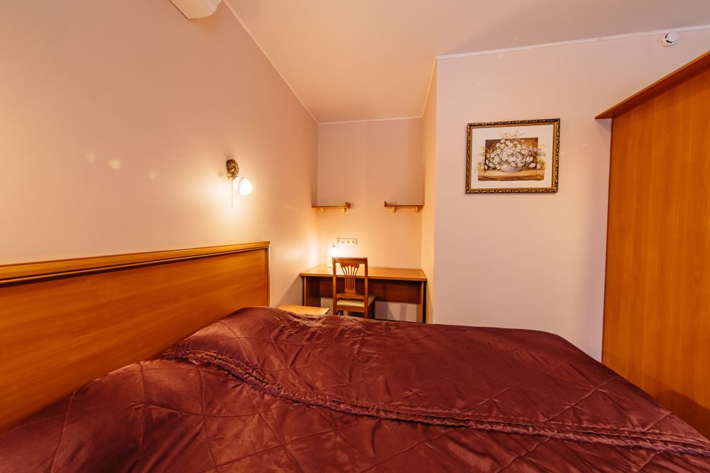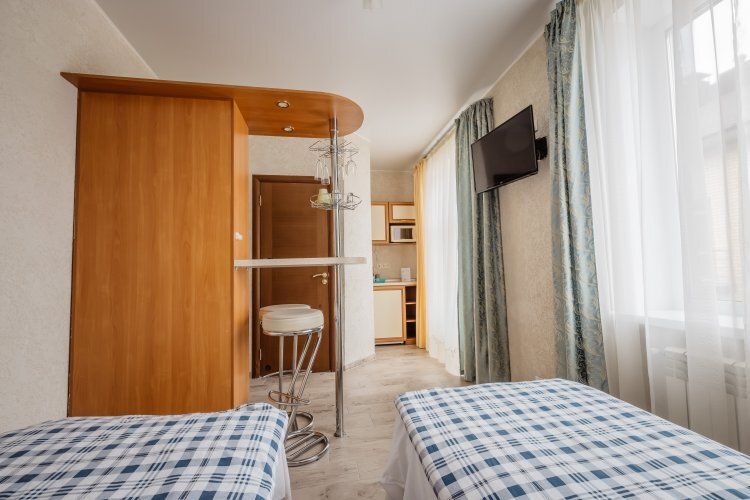 Предусматривает двухместное проживание, оборудована отдельным санузлом и душевой кабиной. В комнате: кухонный уголок с холодильником, мини-баром, эл. чайником, СВЧ и посудой; двуспальная кровать или 2 раздельные кровати (по желанию гостя); плазменный телевизор; шкаф для одежды; кондиционер; 2 табуретки; одноразовые тапочки; бесплатный чай-сахар. Санузел: раковина; унитаз; душевая кабина; фен; банные принадлежности (гель для душа, шампунь, жидкое мыло для рук, зубные наборы). Дополнительно: питание: завтрак (120 руб.-360 руб.), обед и ужин (по меню в любое удобное время); халат (аренда 150 руб.).В гостиничном номере