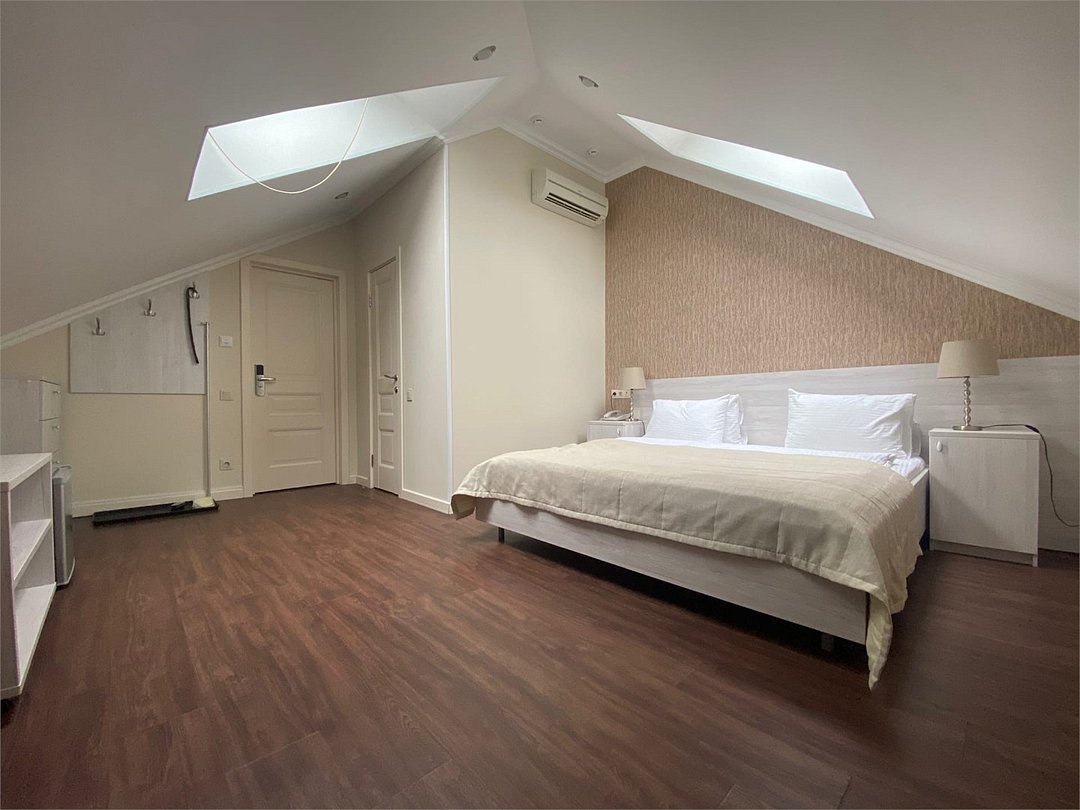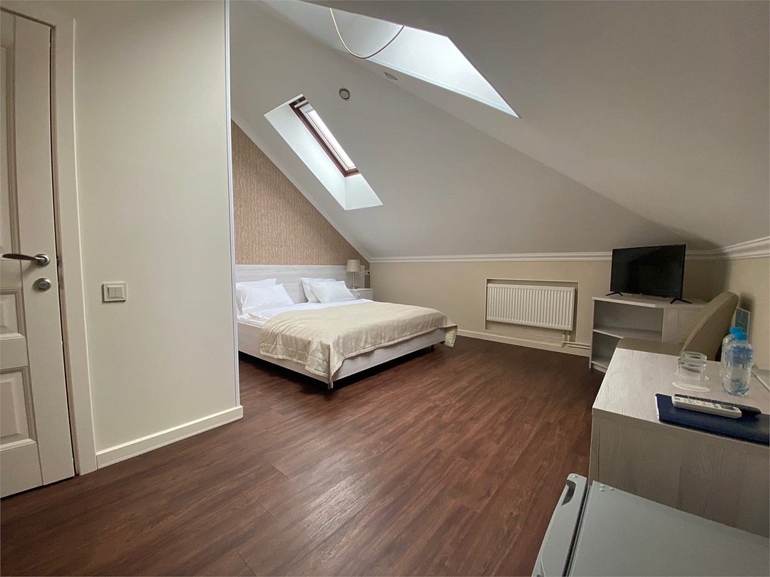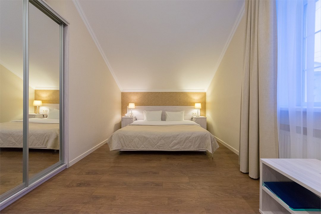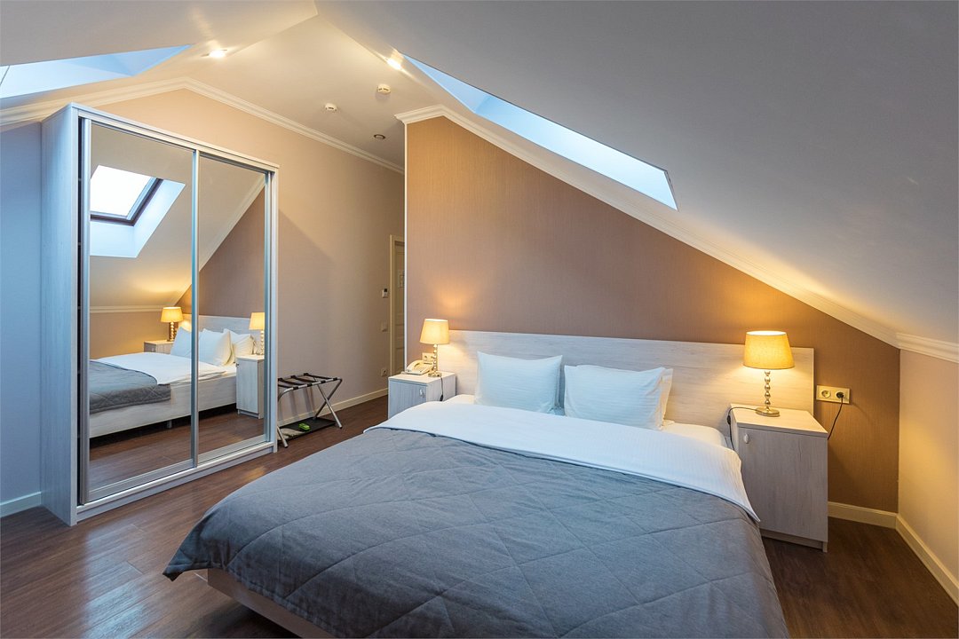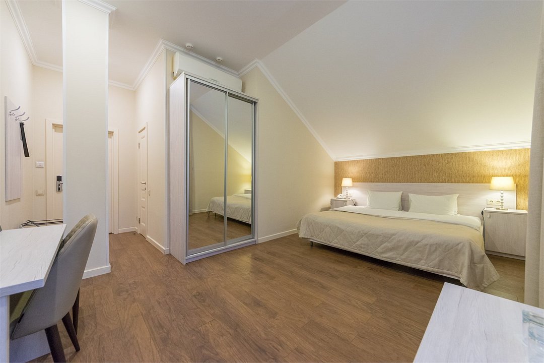 телевизор, Wi-Fi, кондиционер, светильник, настольные лампы, фен, электронные замки, ванная комната, душевая кабина, банные принадлежности, банные полотенца, тапочки, гигиенические средства, кровать «King size», двуспальная кровать, тумбы, стулья, шкаф для одежды, вешалки, журнальный столик, зеркало, комод, обслуживание номеров, питьевая вода, вид во двор, стаканы, стул, туалетные средства, цифровое тв, раскладное кресло, внутренний телефон, мини-холодильник, мансардные окна, номер для некурящих, рабочий стол, можно с питомцамиВ гостиничном номере