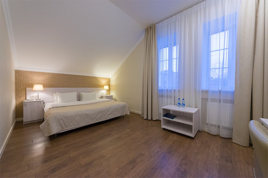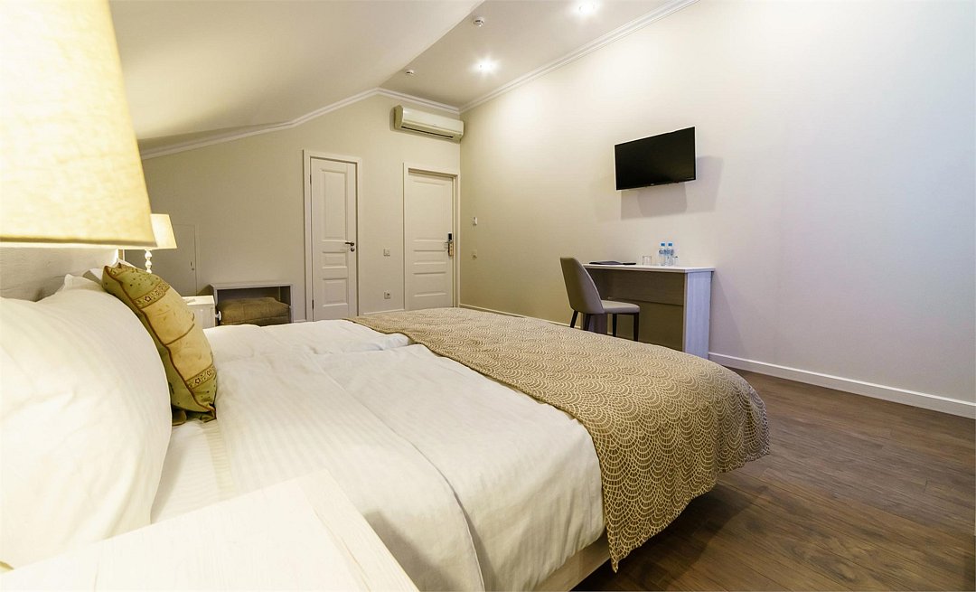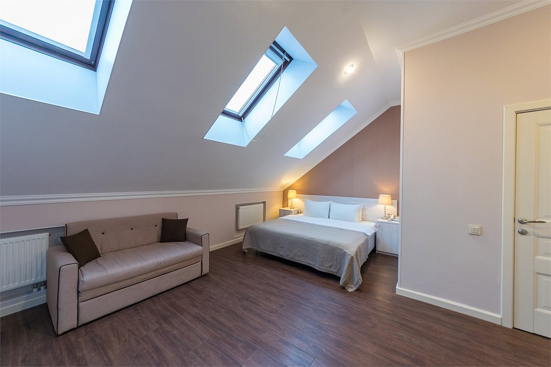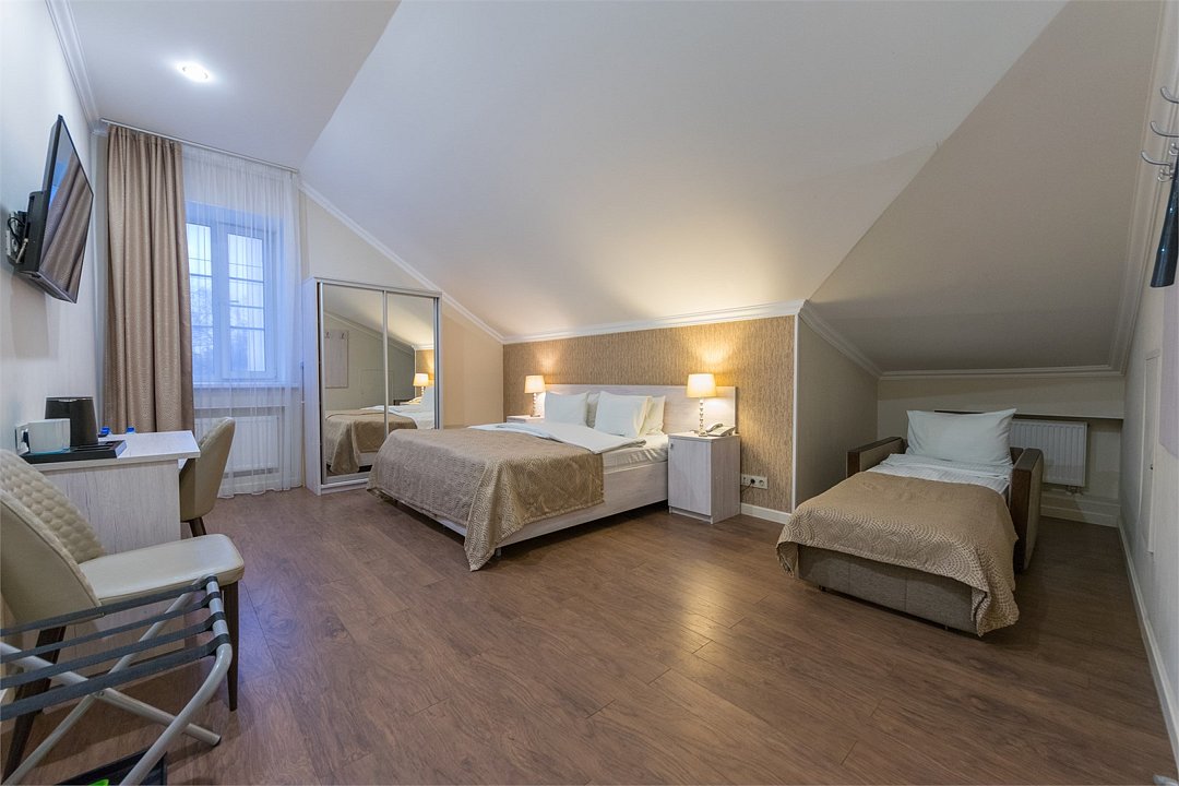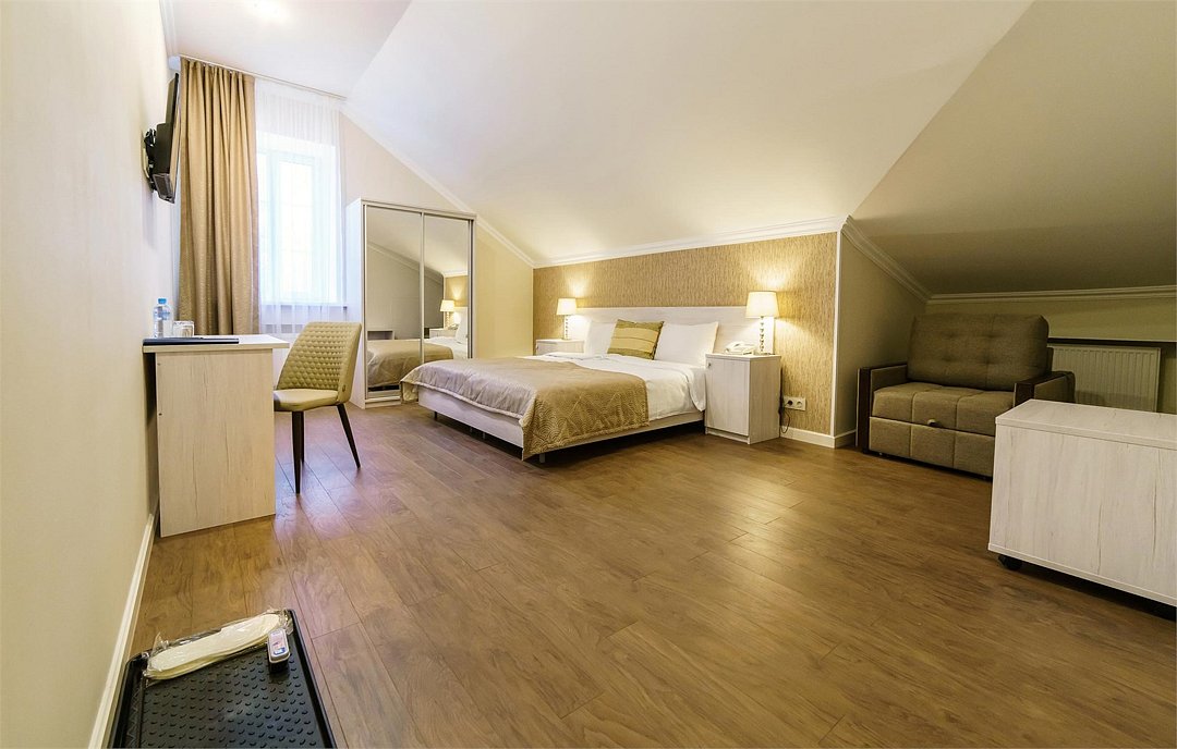 телевизор, Wi-Fi, кондиционер, светильник, настольные лампы, фен, электронные замки, ванная комната, душевая кабина, банные принадлежности, банные полотенца, тапочки, гигиенические средства, кровать «King size», двуспальная кровать, тумбы, стулья, шкаф для одежды, вешалки, журнальный столик, зеркало, комод, обслуживание номеров, питьевая вода, вид во двор, стаканы, стул, туалетные средства, цифровое тв, раскладное кресло, внутренний телефон, мини-холодильник, мансардные окна, номер для некурящих, рабочий стол, можно с питомцамиВ гостиничном номере